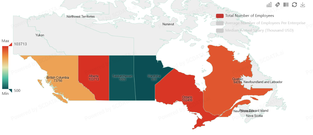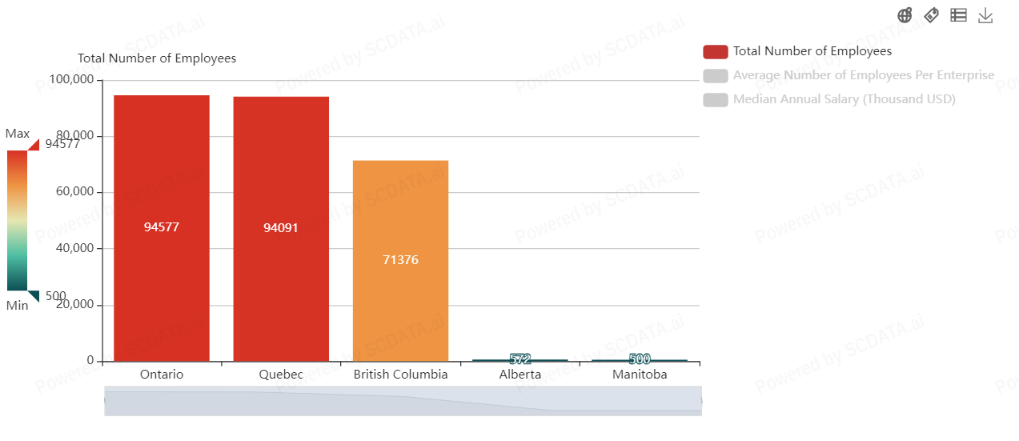 Alberta leads in employment numbers in both sectors with 103,713 employees, closely followed by Ontario with 102,499 employees and Quebec with 94,091 employees. This indicates a strong presence of these sectors in these regions, contributing significantly to their economies.