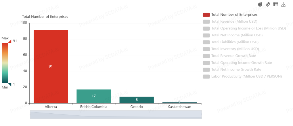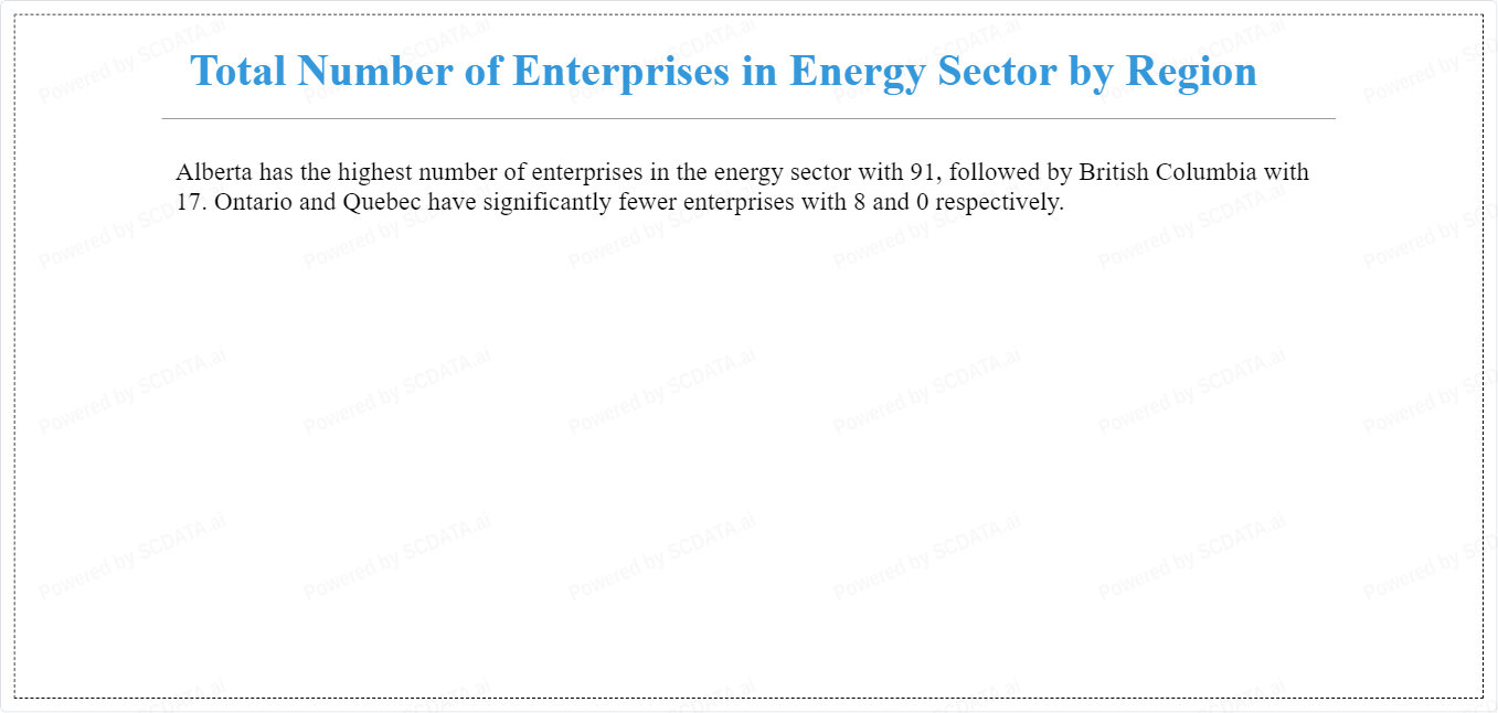 Alberta has the highest number of enterprises in the energy sector with 91, followed by British Columbia with 17. Ontario and Quebec have significantly fewer enterprises with 8 and 0 respectively.
