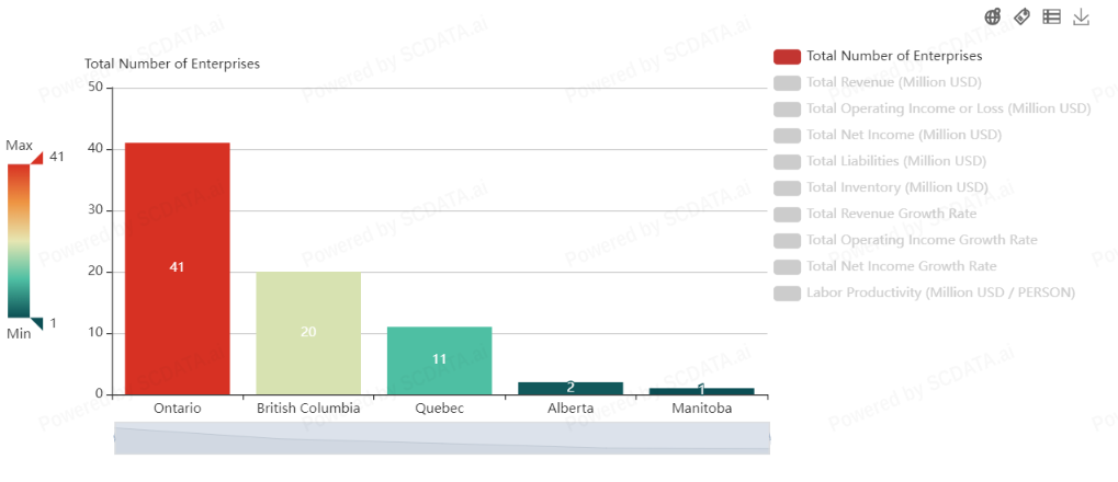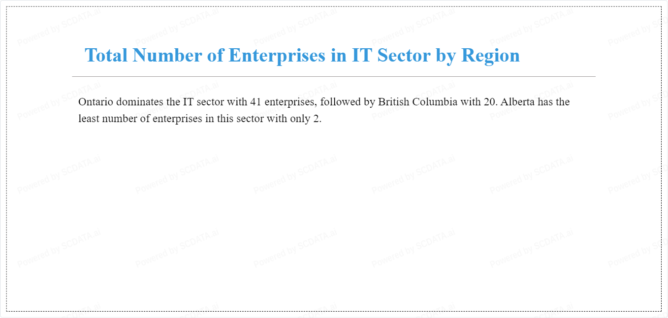 Ontario dominates the IT sector with 41 enterprises, followed by British Columbia with 20. Alberta has the least number of enterprises in this sector with only 2.