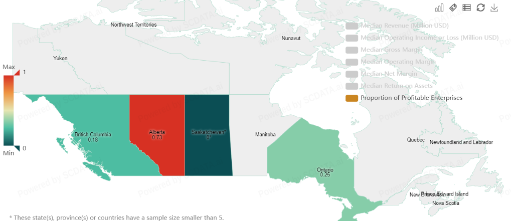 The Energy sector in Alberta stands out as the most promising, based on the high number of employees (103,713), the number of enterprises (91), and the total net income (32,063.98 million USD). The proportion of profitable enterprises is also high (0.73), and the sector shows a positive median net income growth rate (0.84).
