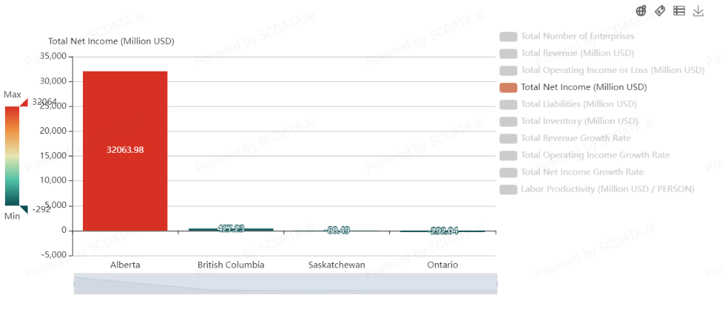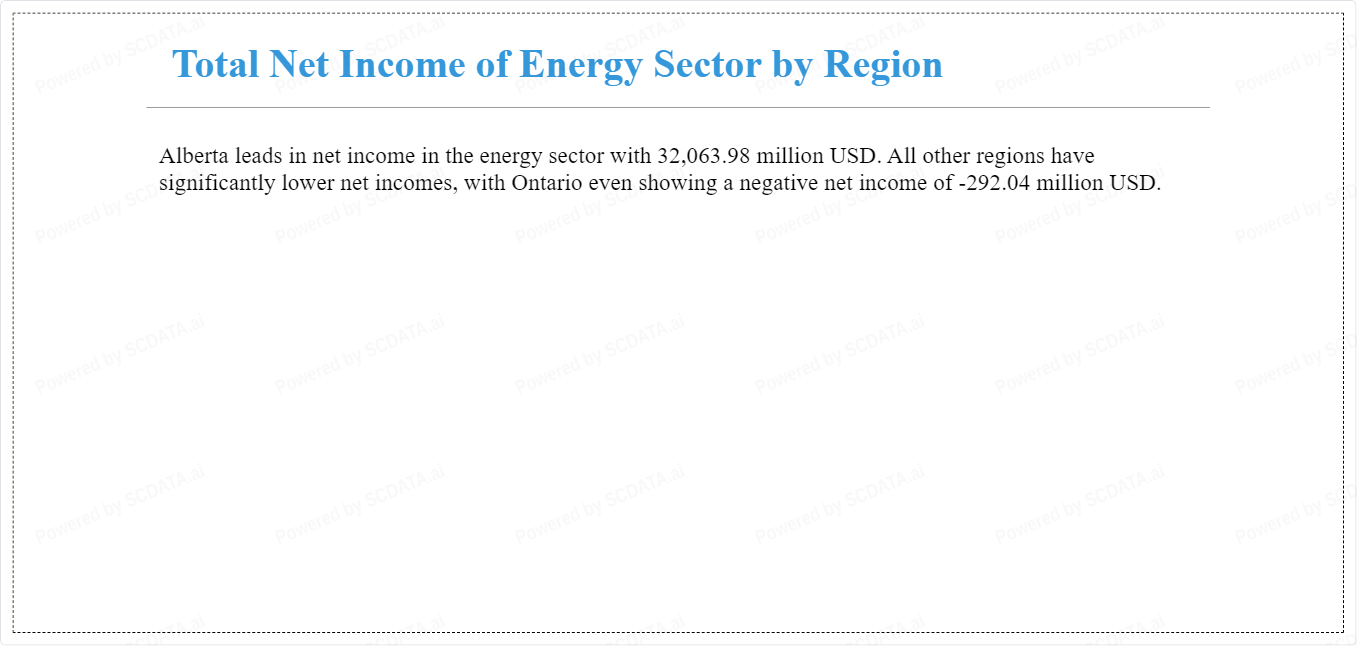 Alberta leads in net income in the energy sector with 32,063.98 million USD. All other regions have significantly lower net incomes, with Ontario even showing a negative net income of -292.04 million USD.