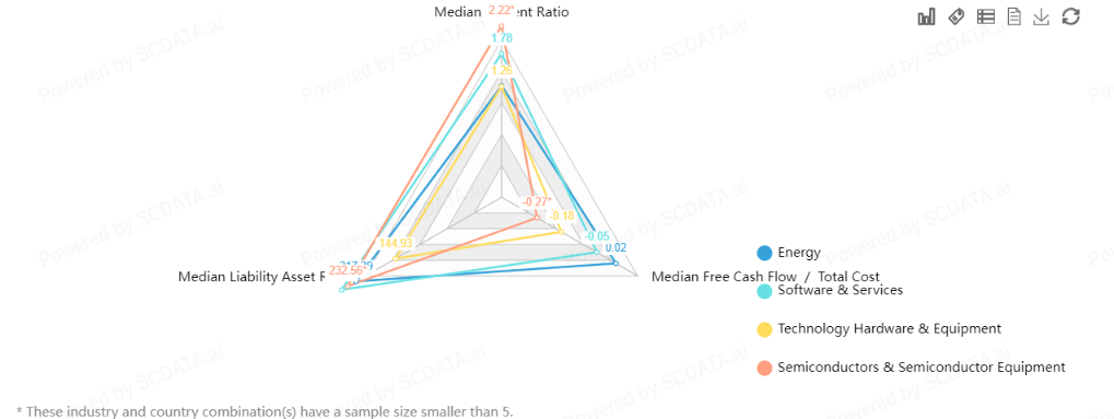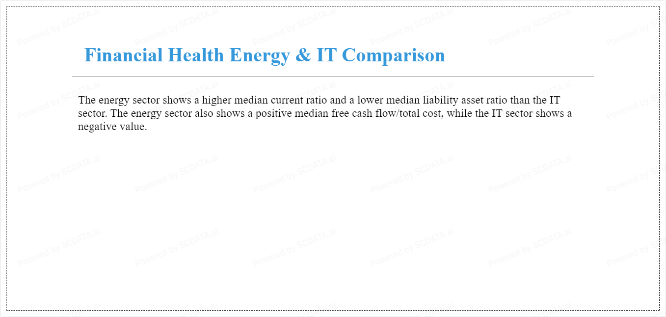 The energy sector shows a higher median current ratio and a lower median liability asset ratio than the IT sector. The energy sector also shows a positive median free cash flow/total cost, while the IT sector shows a negative value.