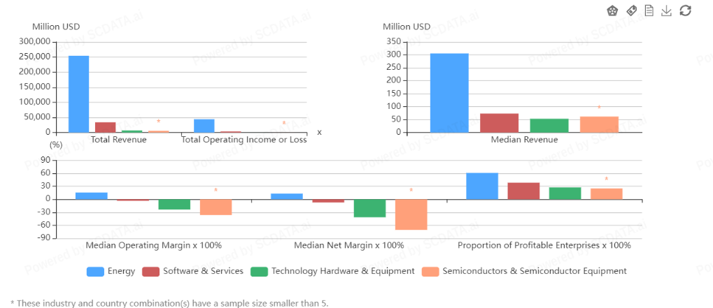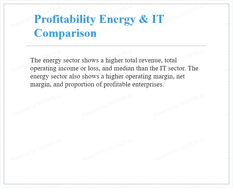 The energy sector shows a higher total revenue, total operating income or loss, and median than the IT sector. The energy sector also shows a higher operating margin, net margin, and proportion of profitable enterprises.