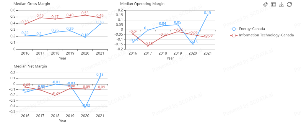 Both the energy and IT sectors show a generally increasing trend in median gross margin. The energy sector shows a fluctuating trend in median net margin and median operating margin, while the IT sector shows a generally decreasing trend.