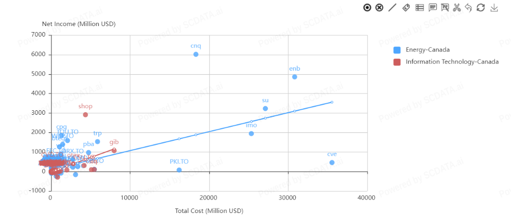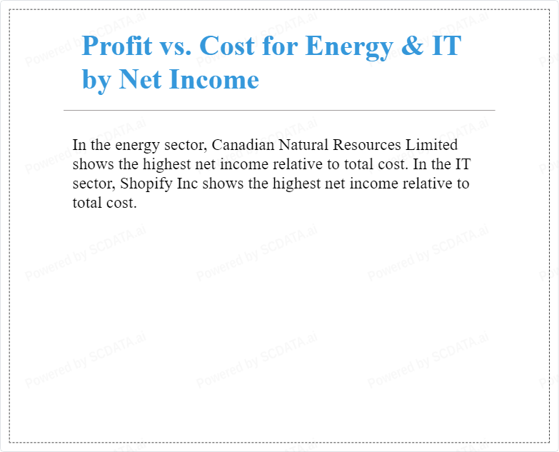 In the energy sector, Canadian Natural Resources Limited shows the highest net income relative to total cost. In the IT sector, Shopify Inc shows the highest net income relative to total cost.