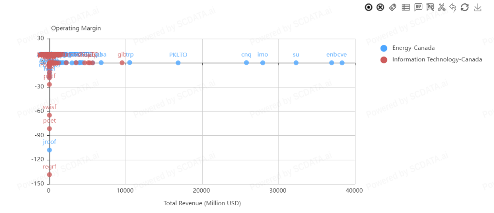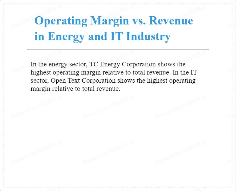 In the energy sector, TC Energy Corporation shows the highest operating margin relative to total revenue. In the IT sector, Open Text Corporation shows the highest operating margin relative to total revenue.
