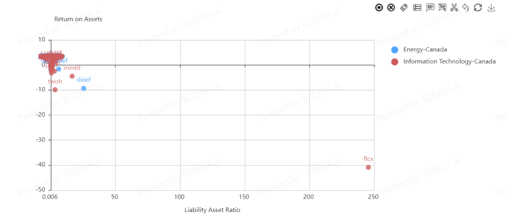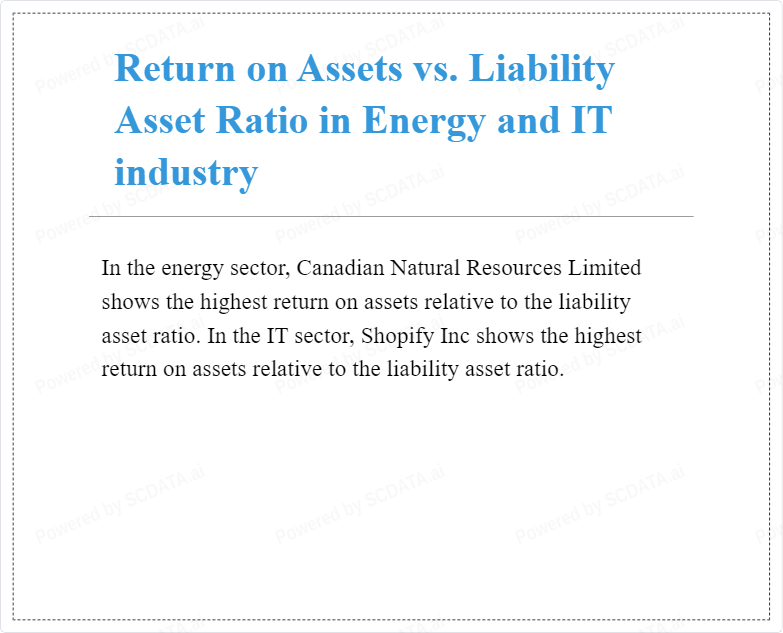In the energy sector, Canadian Natural Resources Limited shows the highest return on assets relative to the liability asset ratio. In the IT sector, Shopify Inc shows the highest return on assets relative to the liability asset ratio.