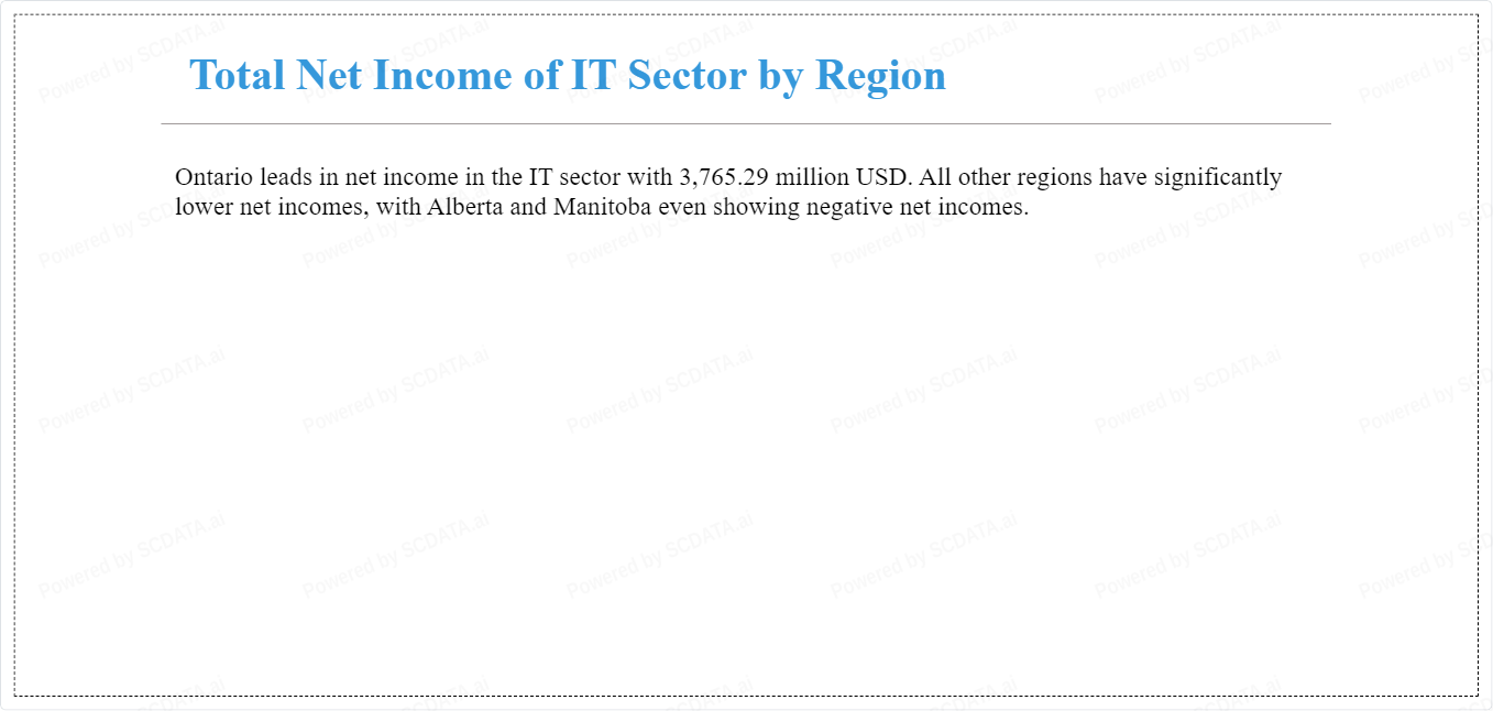 Ontario leads in net income in the IT sector with 3,765.29 million USD. All other regions have significantly lower net incomes, with Alberta and Manitoba even showing negative net incomes.