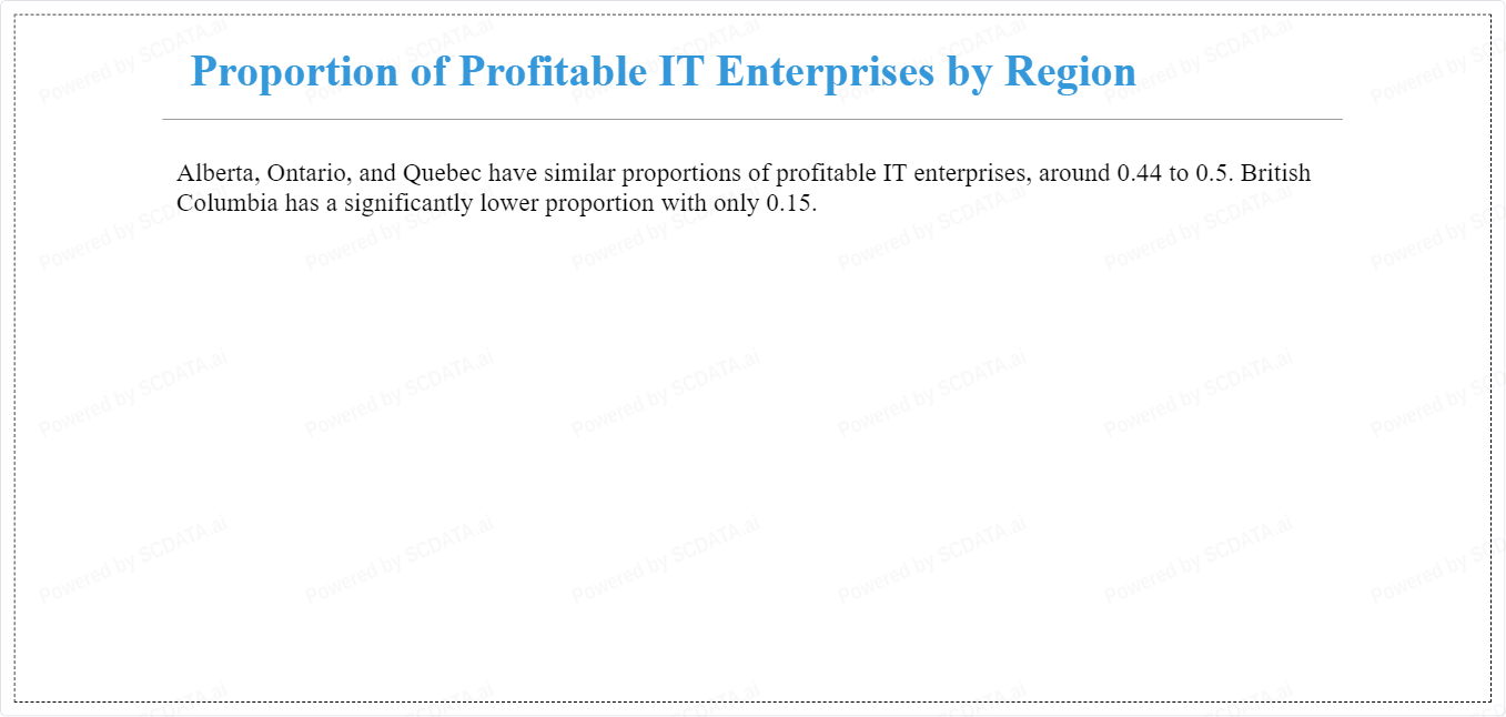Alberta, Ontario, and Quebec have similar proportions of profitable IT enterprises, around 0.44 to 0.5. British Columbia has a significantly lower proportion with only 0.15.