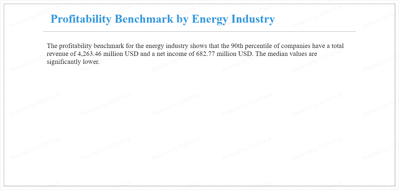 The profitability benchmark for the energy industry shows that the 90th percentile of companies have a total revenue of 4,263.46 million USD and a net income of 682.77 million USD. The median values are significantly lower.