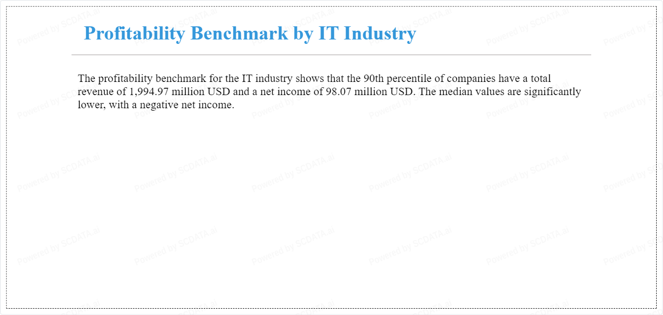The profitability benchmark for the IT industry shows that the 90th percentile of companies have a total revenue of 1,994.97 million USD and a net income of 98.07 million USD. The median values are significantly lower, with a negative net income.