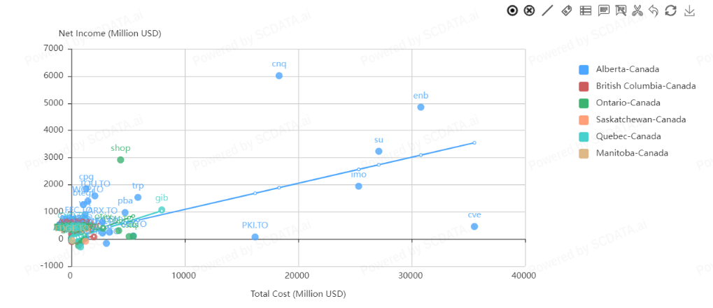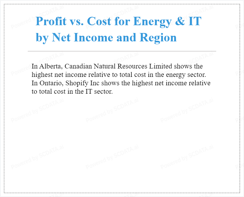 In Alberta, Canadian Natural Resources Limited shows the highest net income relative to total cost in the energy sector. In Ontario, Shopify Inc shows the highest net income relative to total cost in the IT sector.