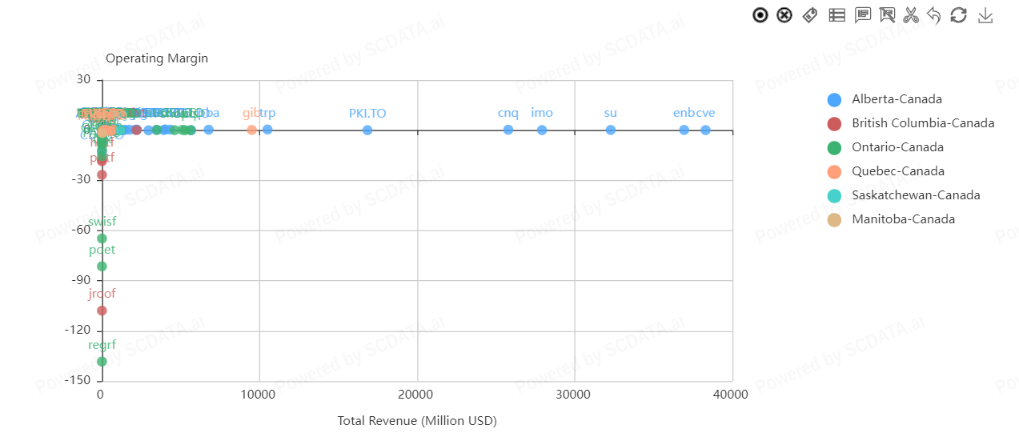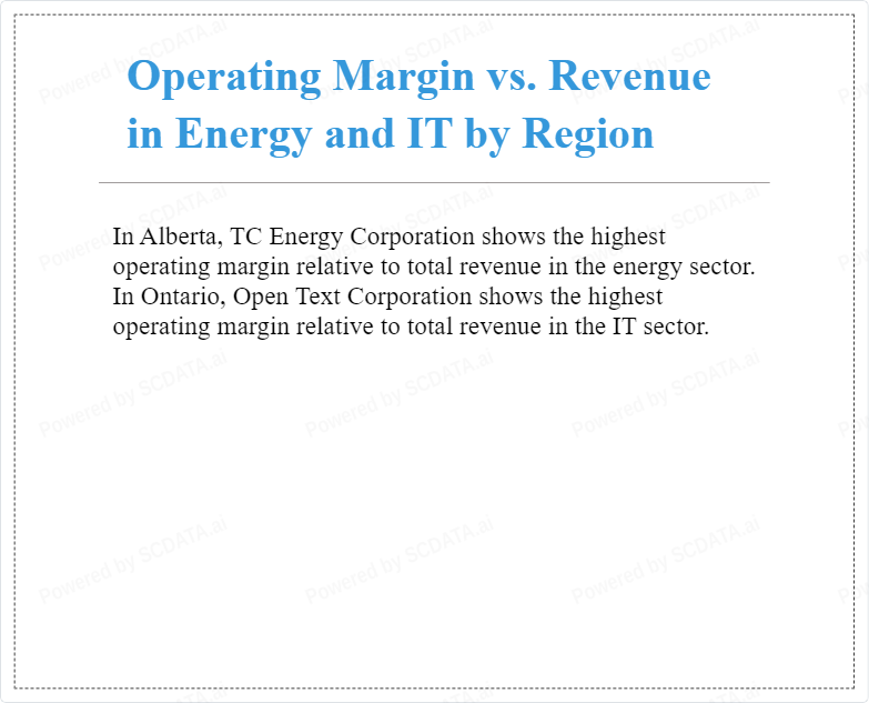 In Alberta, TC Energy Corporation shows the highest operating margin relative to total revenue in the energy sector. In Ontario, Open Text Corporation shows the highest operating margin relative to total revenue in the IT sector.