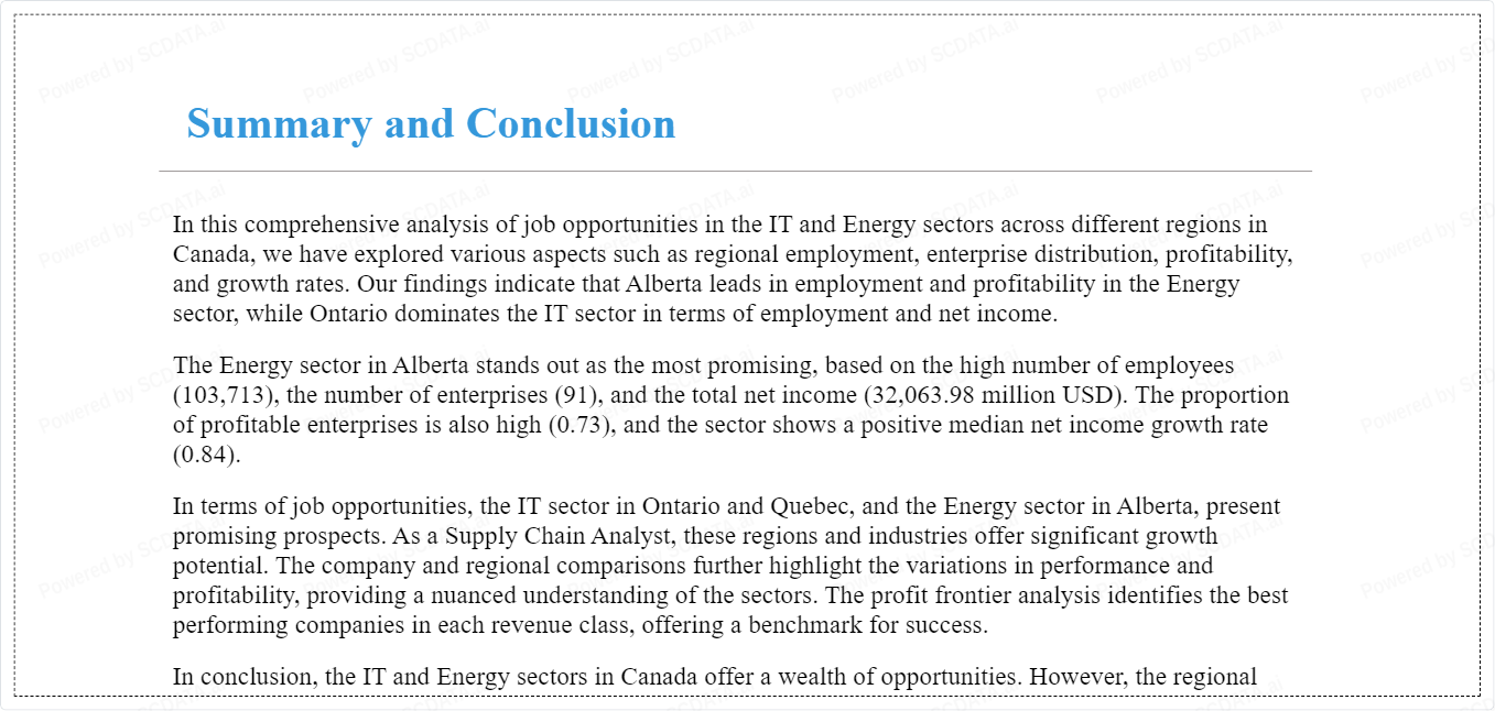 In this comprehensive analysis of job opportunities in the IT and Energy sectors across different regions in Canada, we have explored various aspects such as regional employment, enterprise distribution, profitability, and growth rates. Our findings indicate that Alberta leads in employment and profitability in the Energy sector, while Ontario dominates the IT sector in terms of employment and net income.