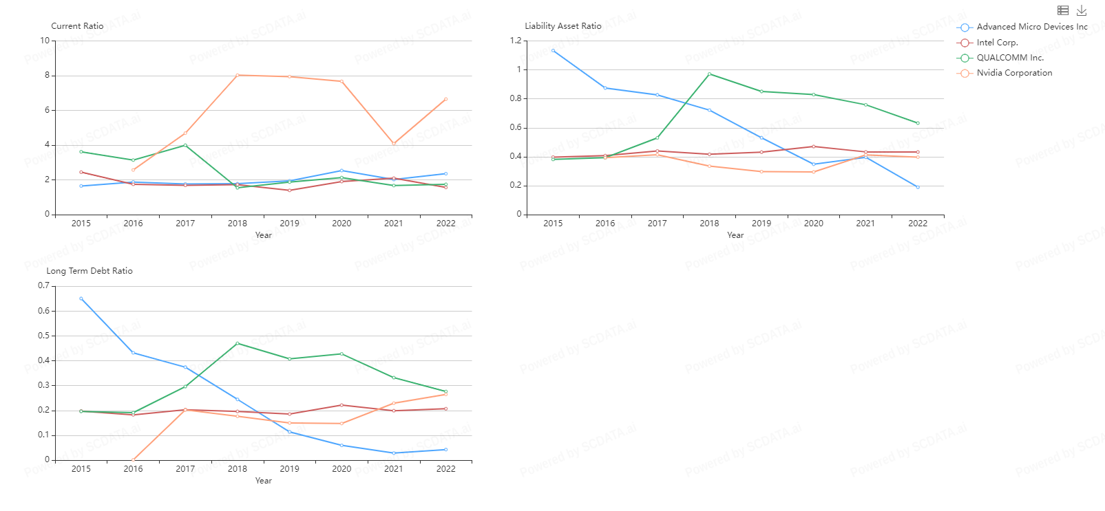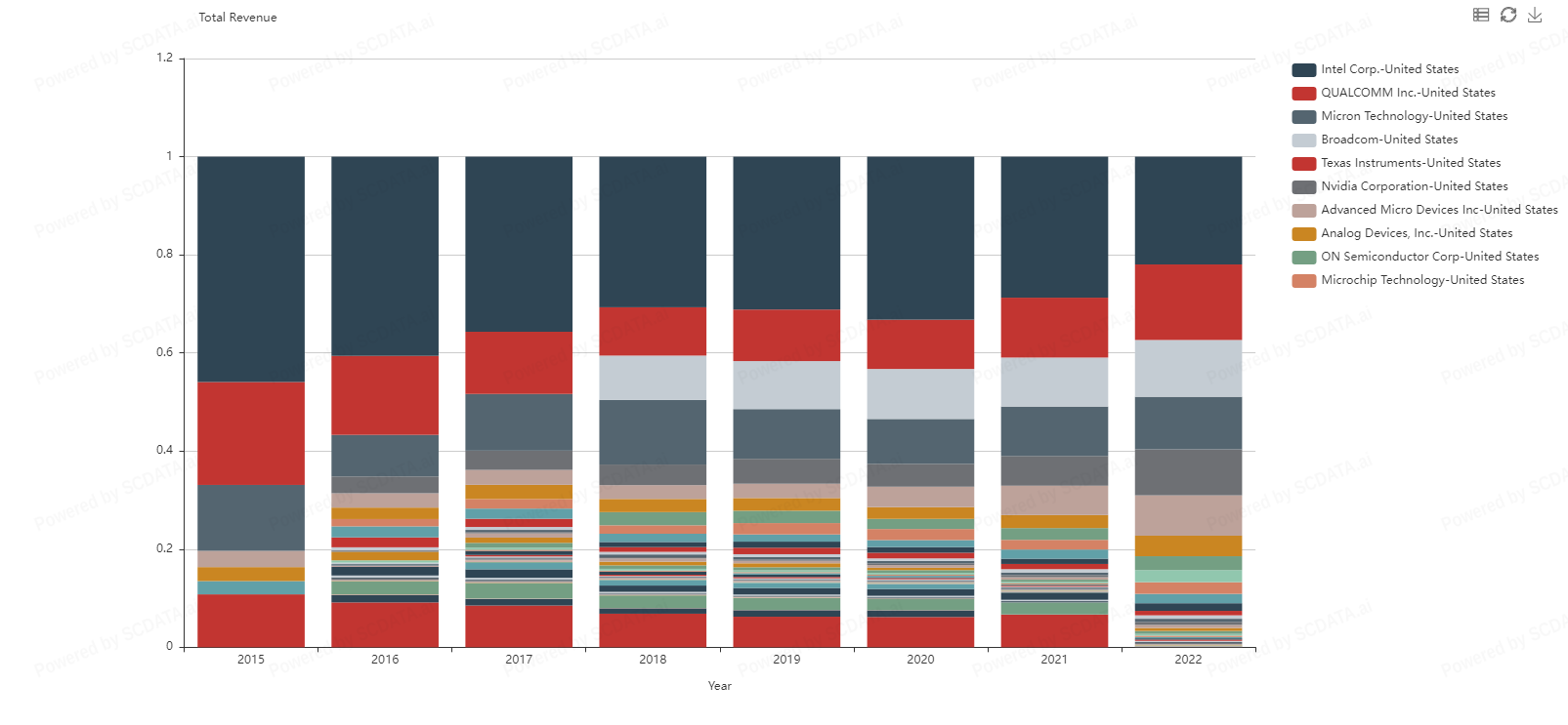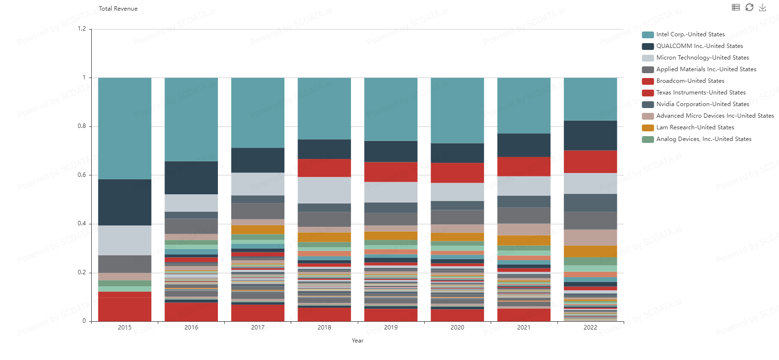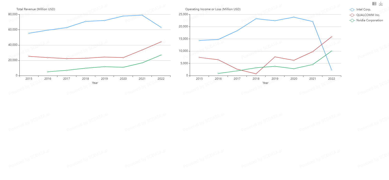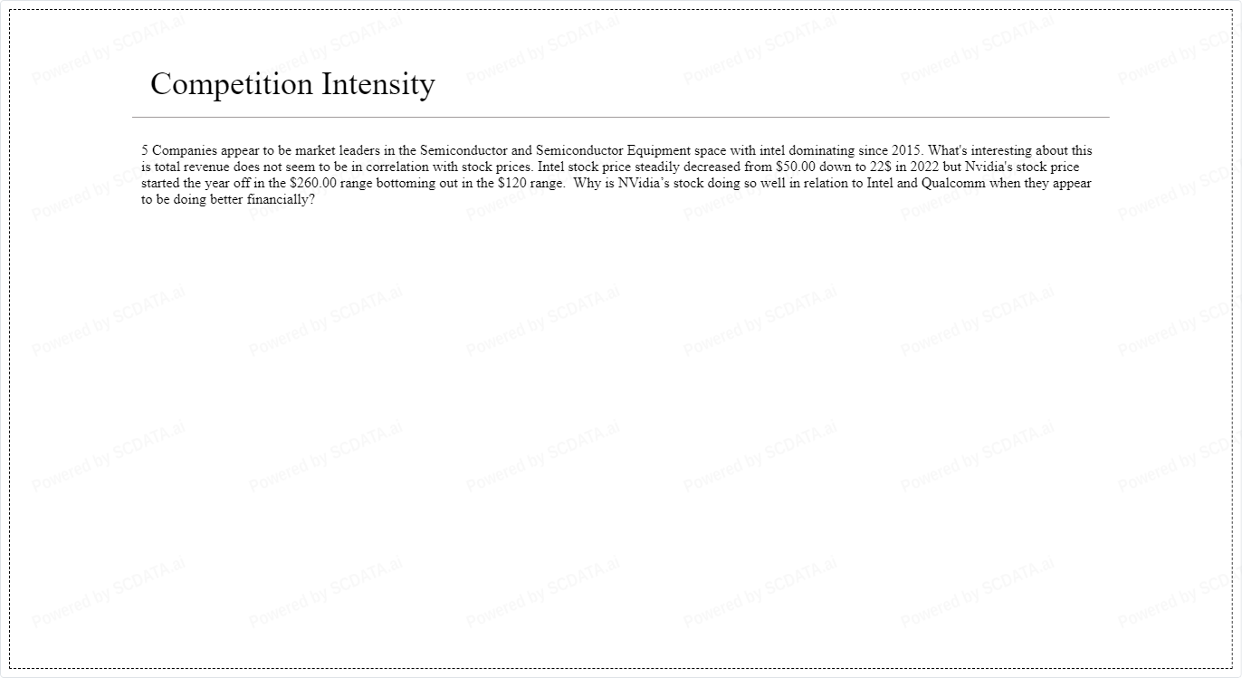 5 Companies appear to be market leaders in the Semiconductor and Semiconductor Equipment space with intel dominating since 2015. What's interesting about this is total revenue does not seem to be in correlation with stock prices. Intel stock price steadily decreased from $50.00 down to 22$ in 2022 but Nvidia's stock price started the year off in the $260.00 range bottoming out in the $120 range. Why is NVidia’s stock doing so well in relation to Intel and Qualcomm when they appear to be doing better financially?