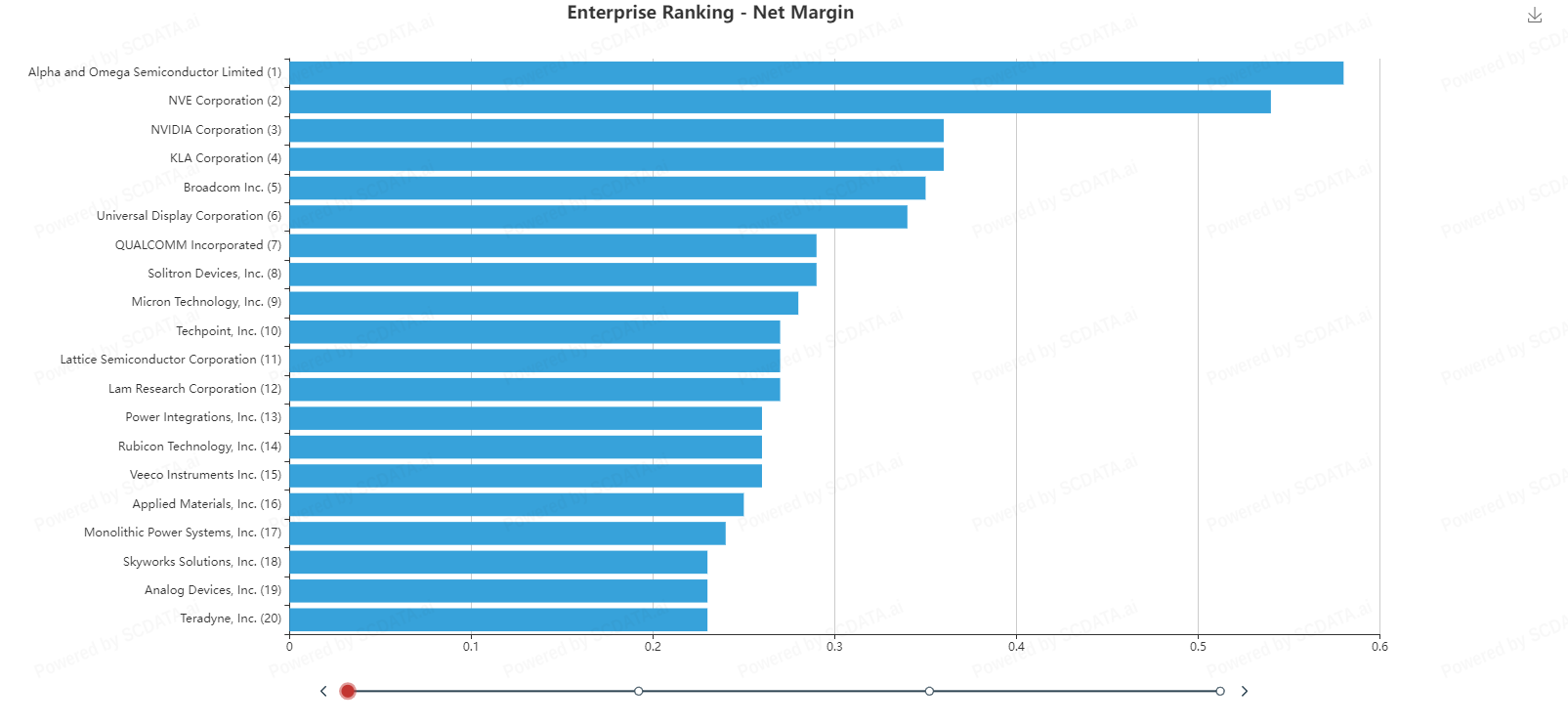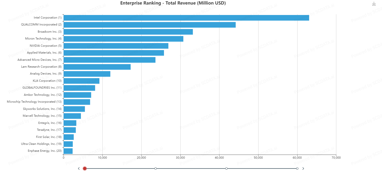 Intel is the largest semiconductor company with Qualcomm coming in second place and NVIDIA coming in 5th place. If you look at these rankings in relation to the enterprise rankings on the next slide Intel isn't even on the list in terms of the most profitable companies. That would explain why their stock as dropped so much. Even though NVIDIA comes in 5th for size it comes in 3rd for profit which might explain why the stock is doing so well.