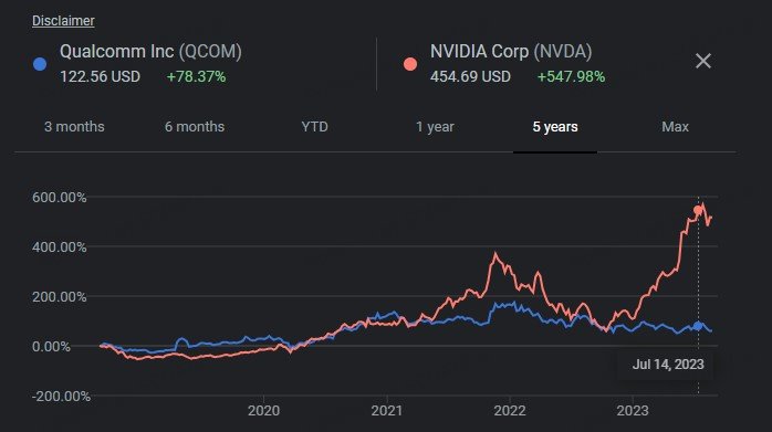 Nvidia Corporation's stock has been soaring all of 2023 and soared all of 2022 while Qualcomm Inc's stock has remained relatively flat.