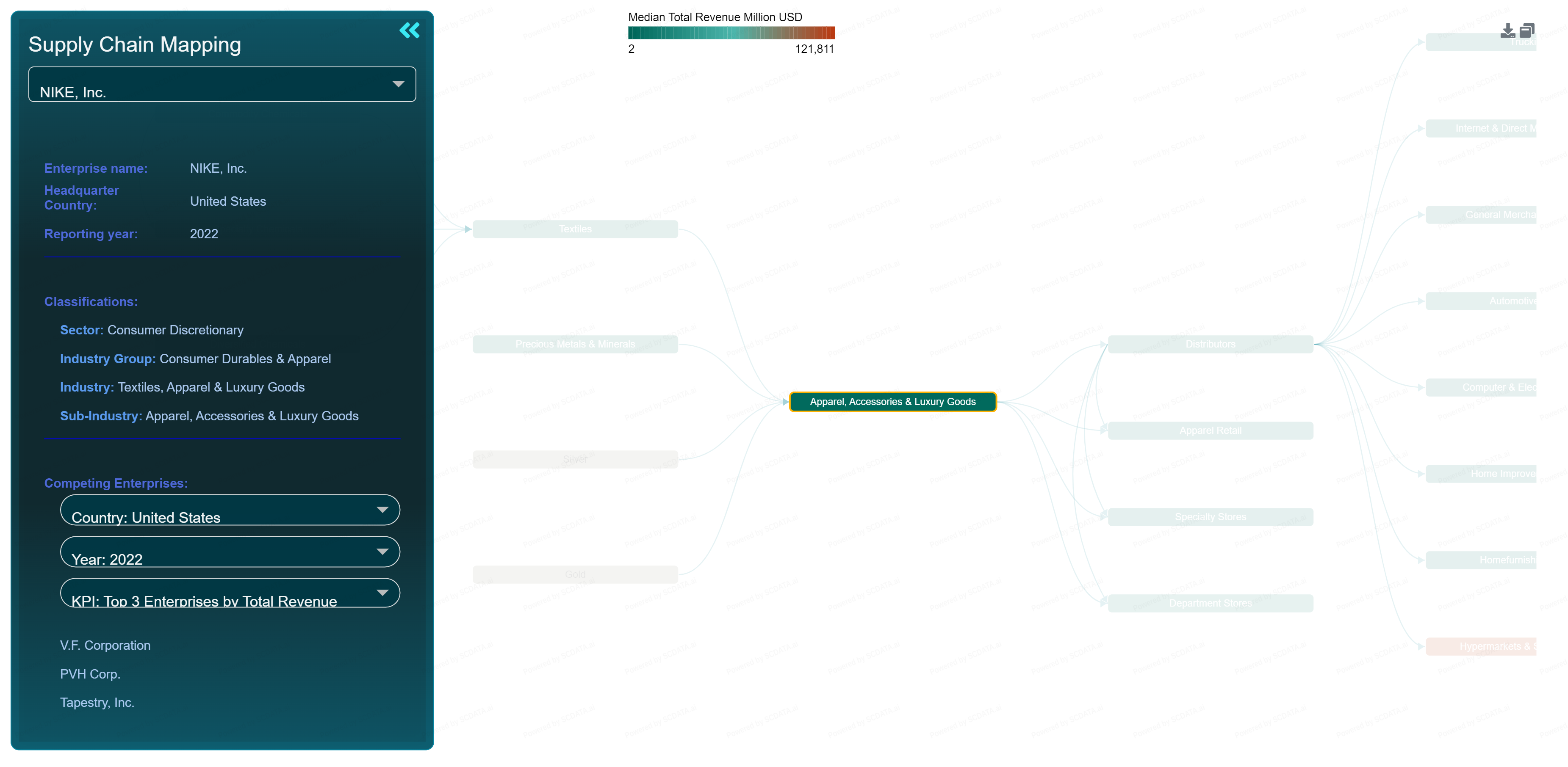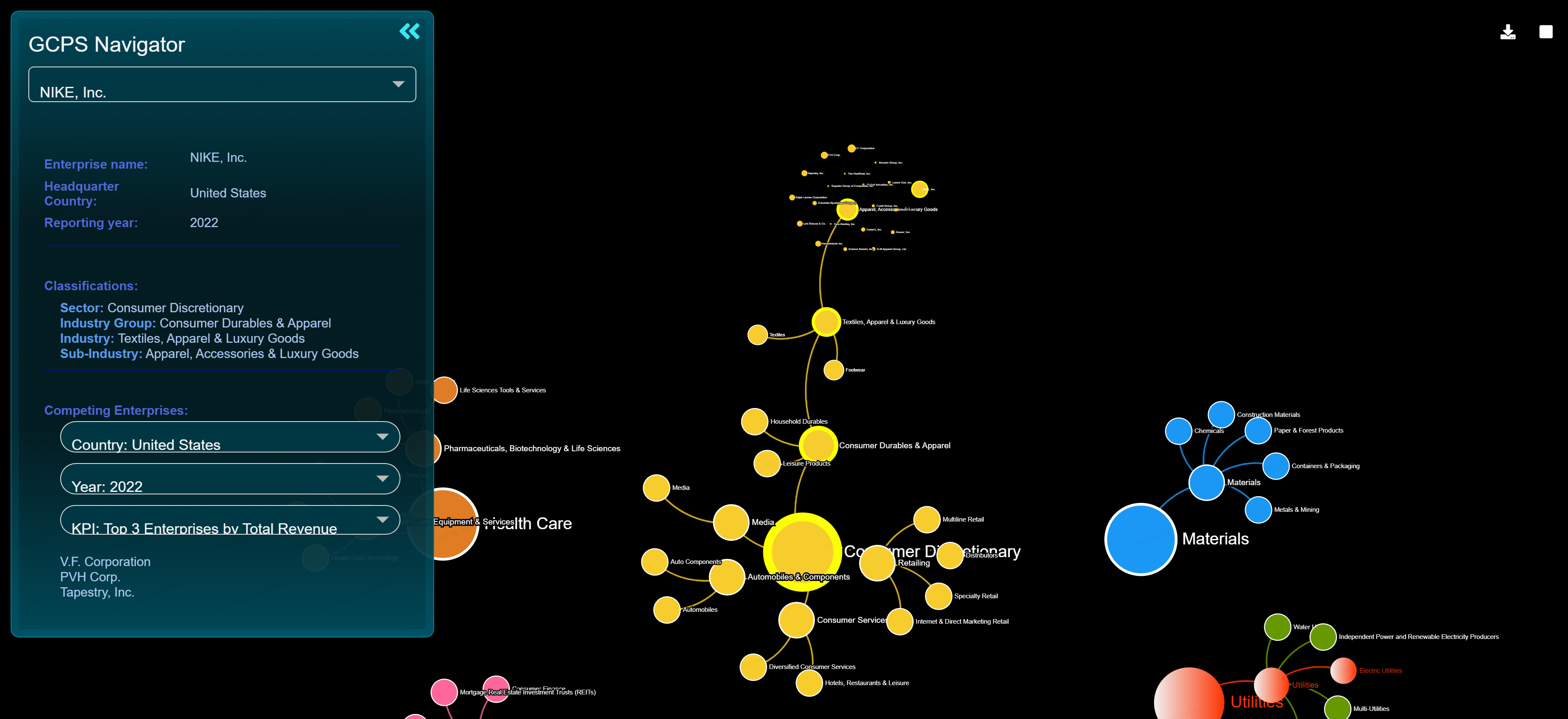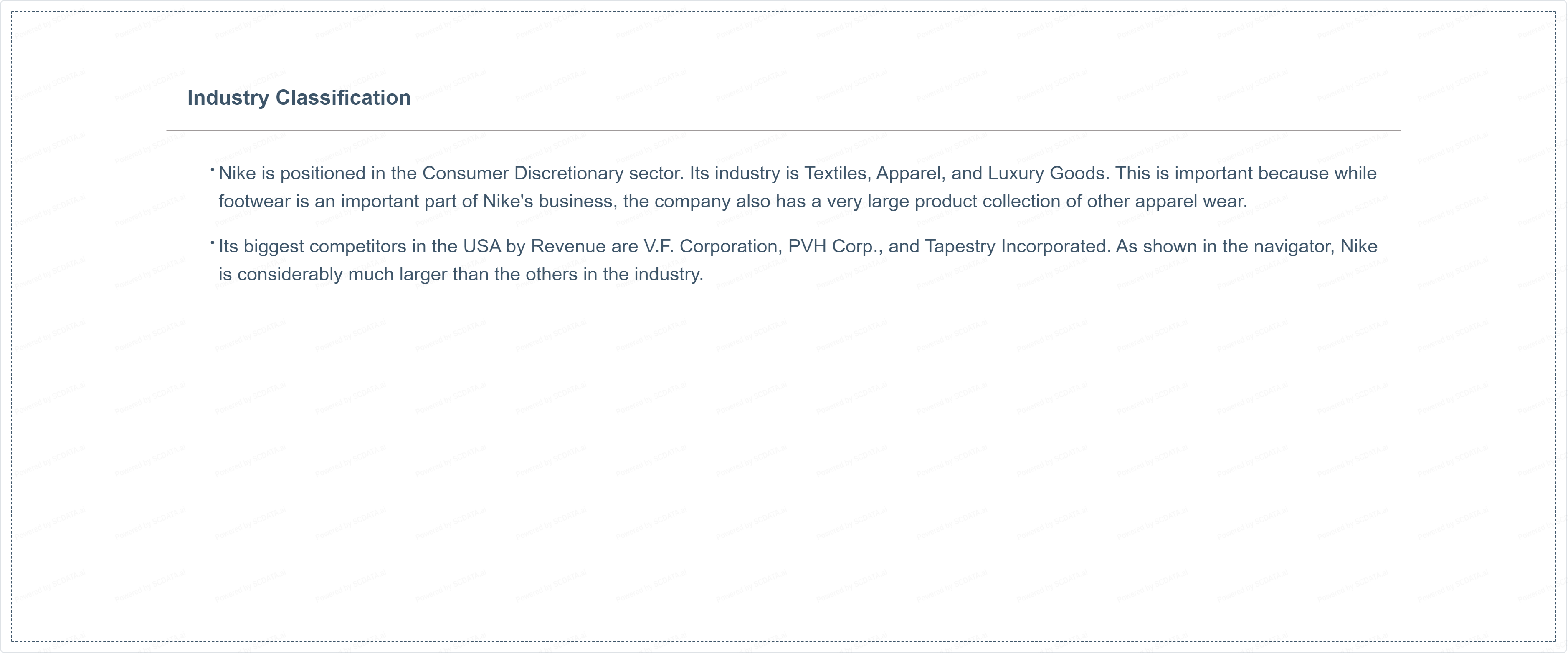 Its biggest competitors in the USA by Revenue are V.F. Corporation, PVH Corp., and Tapestry Incorporated. As shown in the navigator, Nike is considerably much larger than the others in the industry.