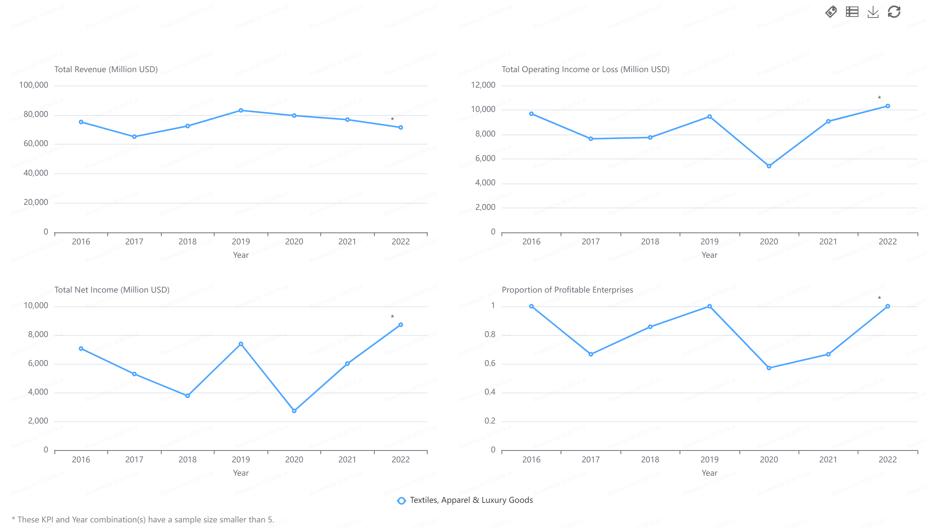 Operating income and the proportion of profitable enterprises show a similar pattern. Some steady growth and then a drop in 2020 before steadily climbing back up. The pandemic seems to have hurt this industry especially hard but it seems to have recovered in the years since.