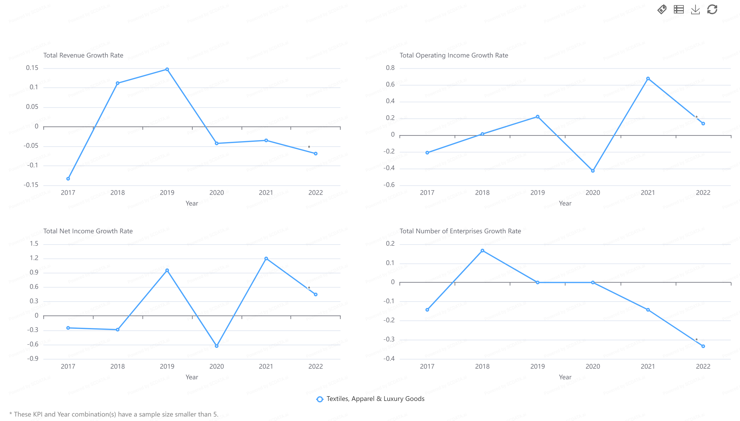 Growth seems to be a much different story. Both revenue and net income growth seem to be decreasing in the post-pandemic world. Operating income and the number of growing enterprises show the same thing. Bottom line, the industry is struggling to grow in a post-COVID world.