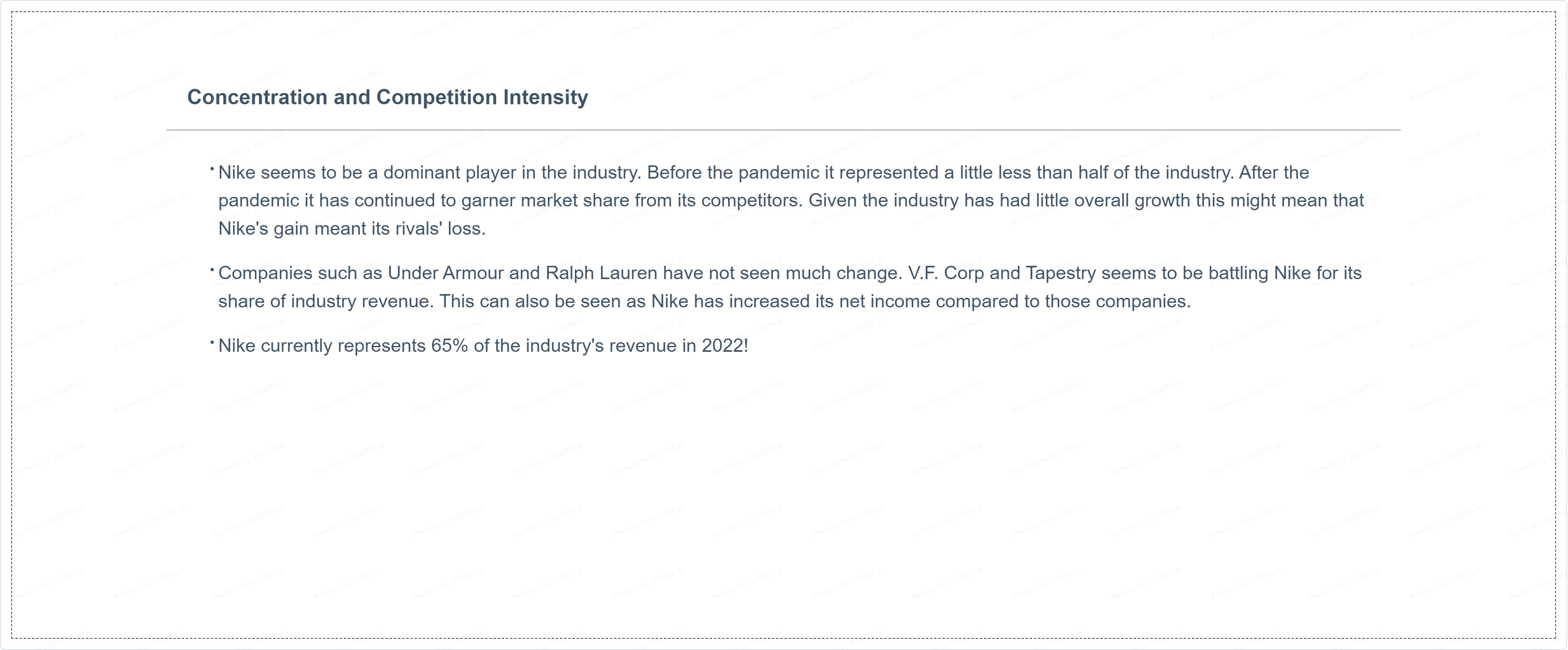 Nike seems to be a dominant player in the industry. Before the pandemic it represented a little less than half of the industry. After the pandemic it has continued to garner market share from its competitors. Given the industry has had little overall growth this might mean that Nike's gain meant its rivals' loss.