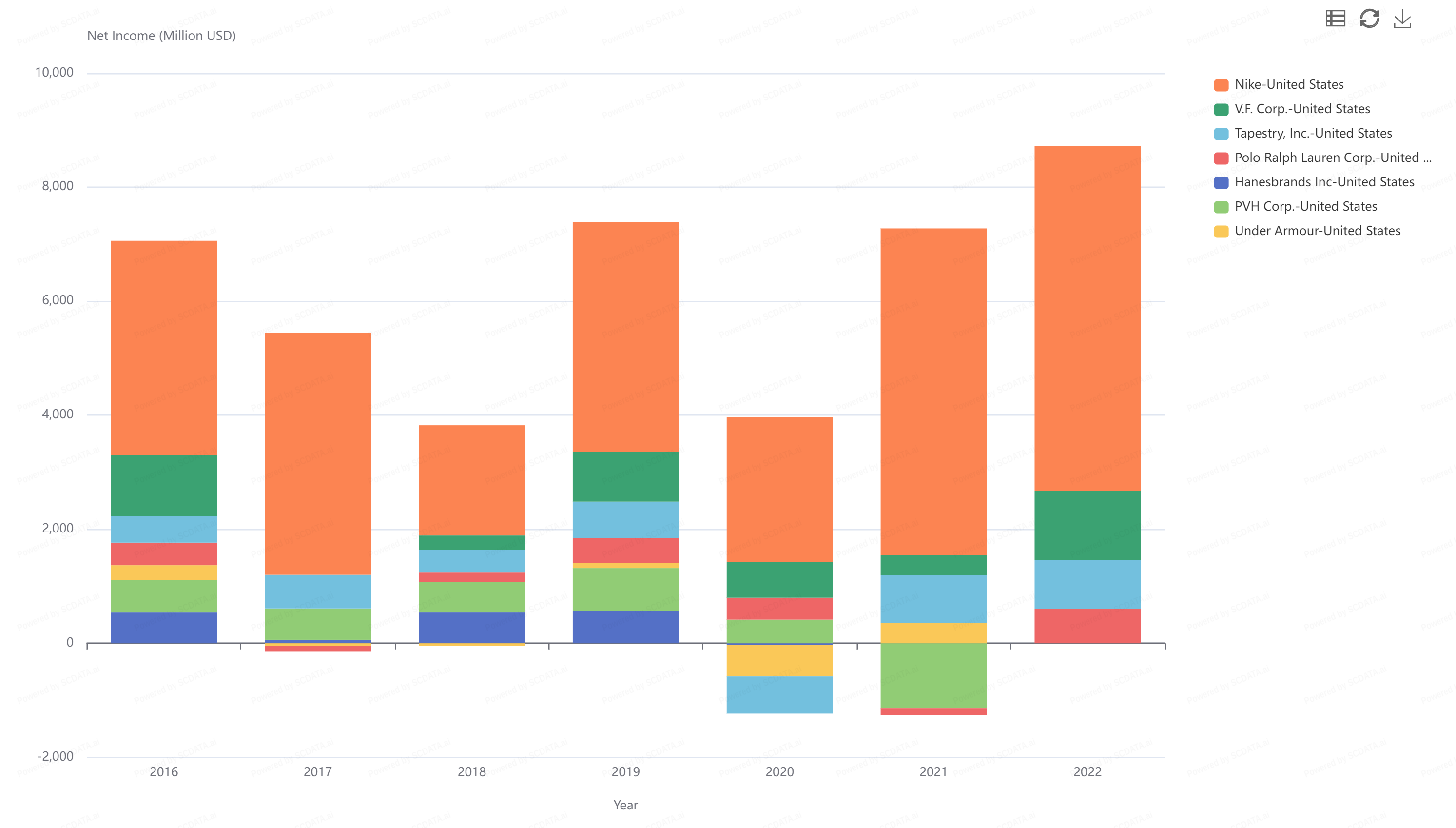 Companies such as Under Armour and Ralph Lauren have not seen much change. V.F. Corp and Tapestry seems to be battling Nike for its share of industry revenue. This can also be seen as Nike has increased its net income compared to those companies.