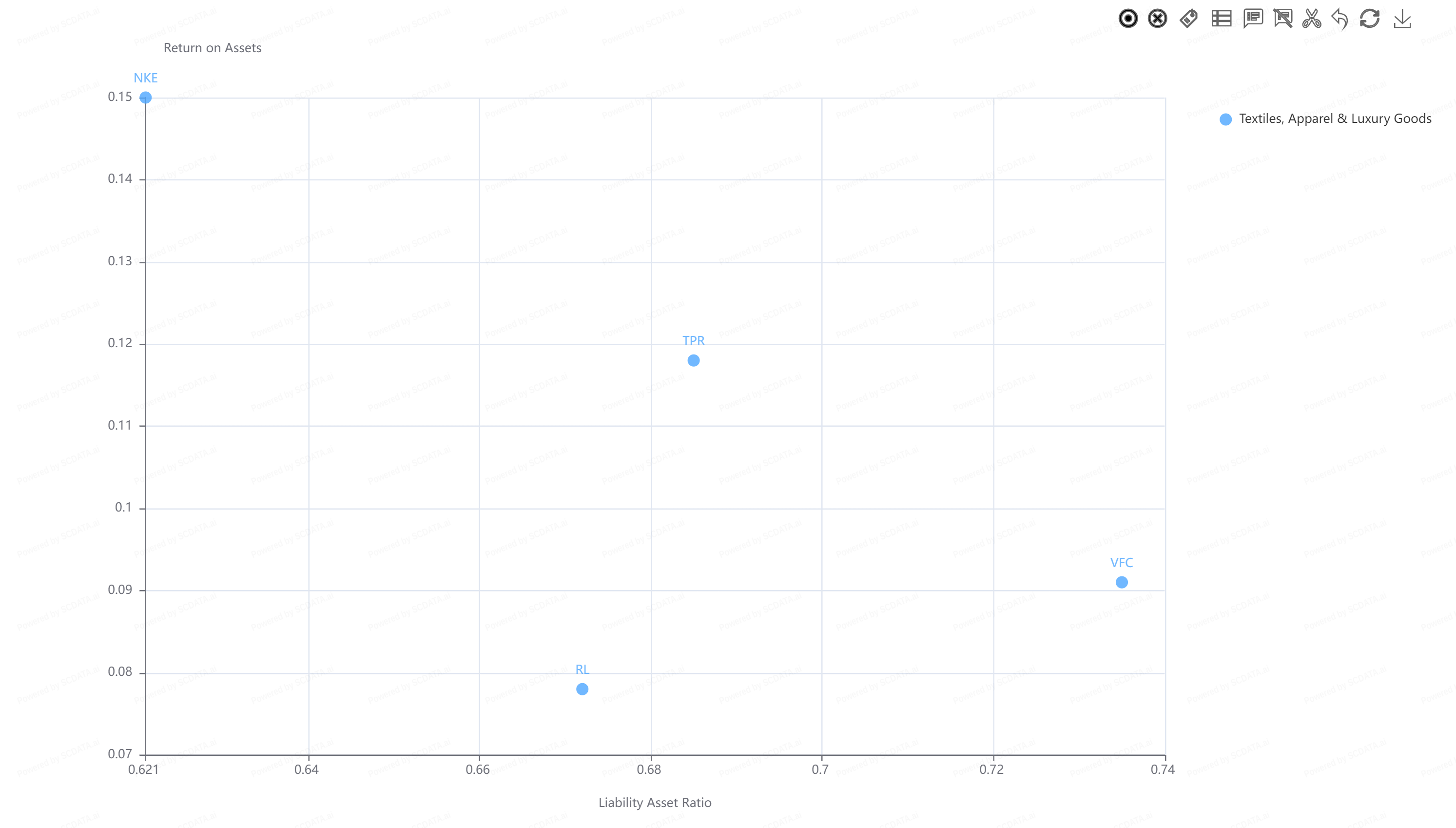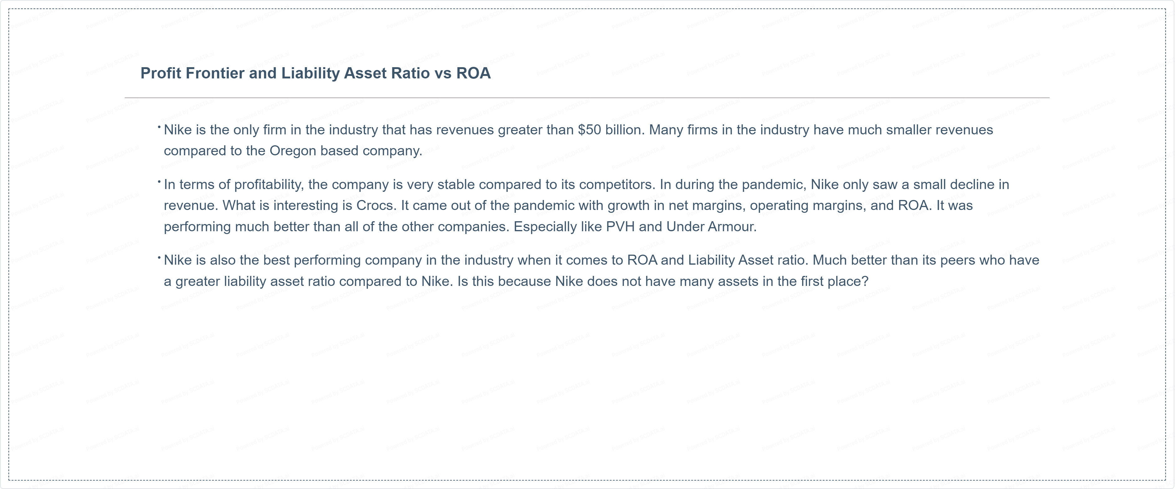 Nike is also the best performing company in the industry when it comes to ROA and Liability Asset ratio. Much better than its peers who have a greater liability asset ratio compared to Nike. Is this because Nike does not have many assets in the first place?