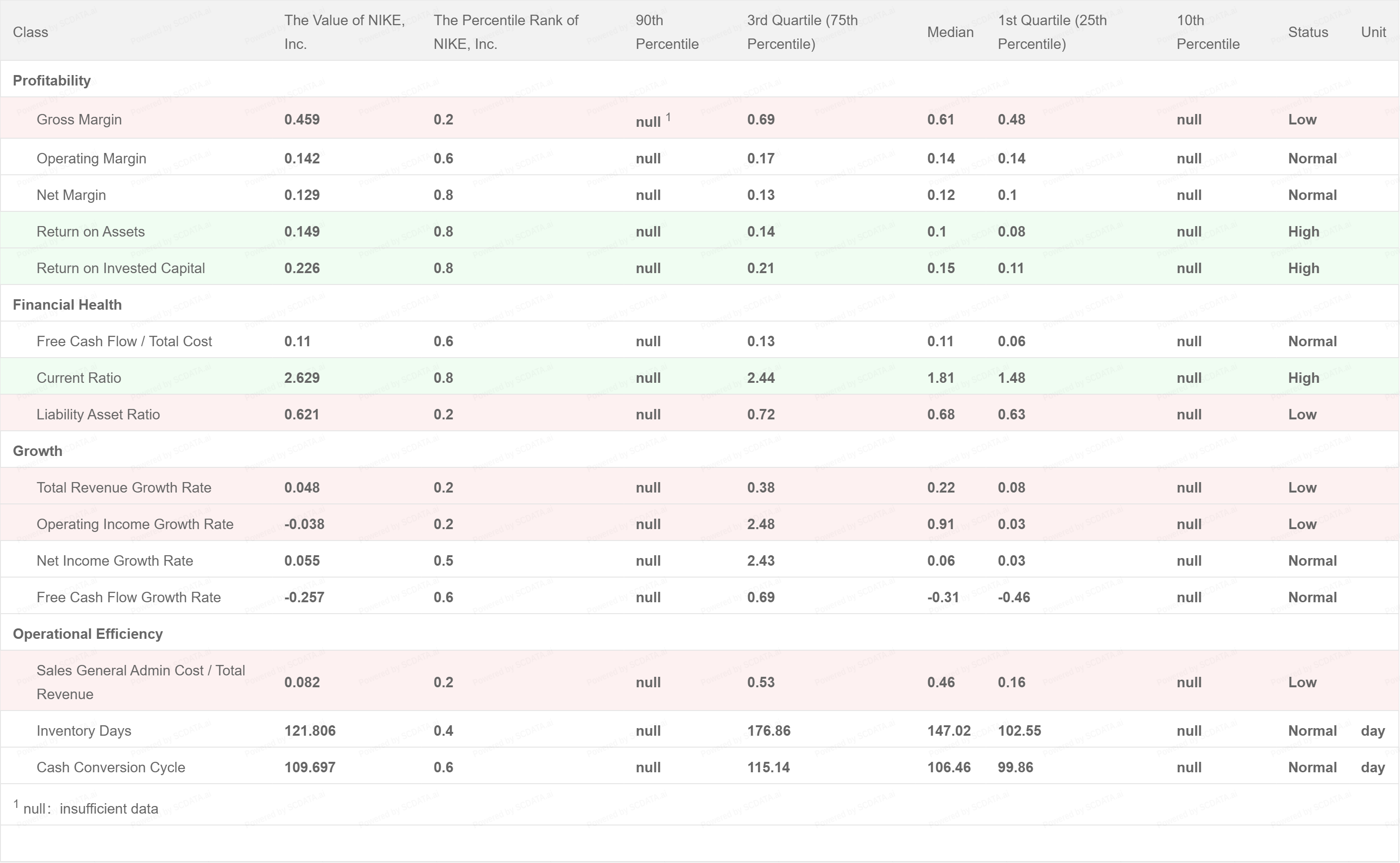 Nike has a low level of gross margin, 0.459, which puts it slightly outside of the first quartile in the industry. It does however have a very good ROA and ROIC. Both standing at 0.149 and 0.226 which makes it into the 80th percentile.
