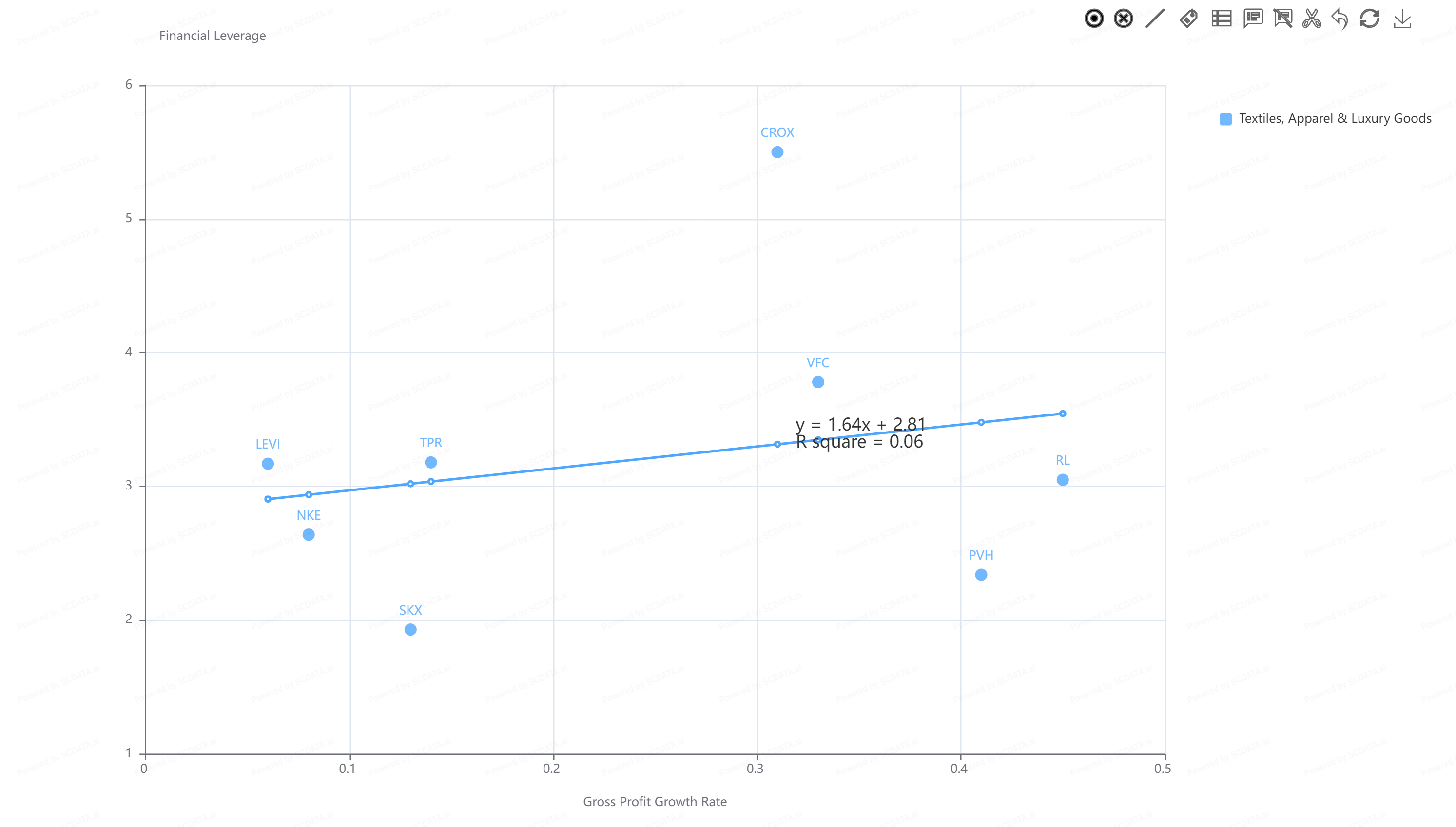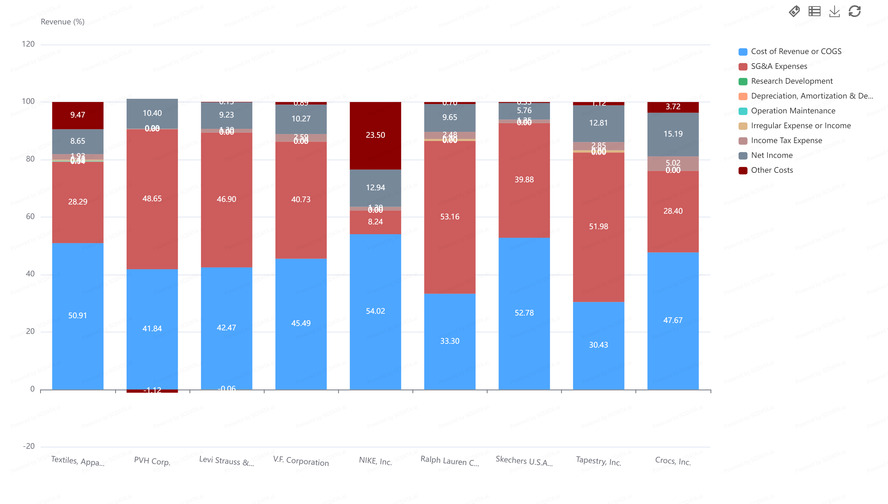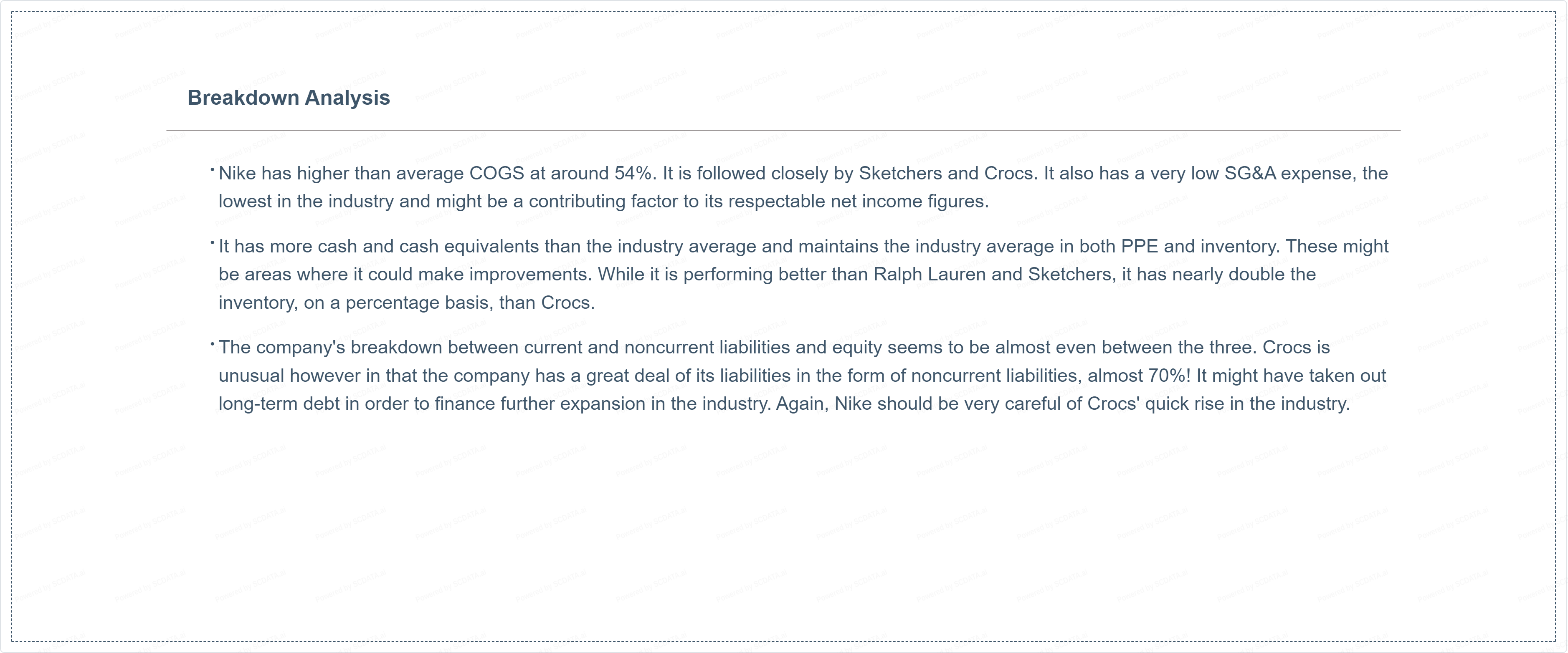 Nike has higher than average COGS at around 54%. It is followed closely by Sketchers and Crocs. It also has a very low SG&A expense, the lowest in the industry and might be a contributing factor to its respectable net income figures.