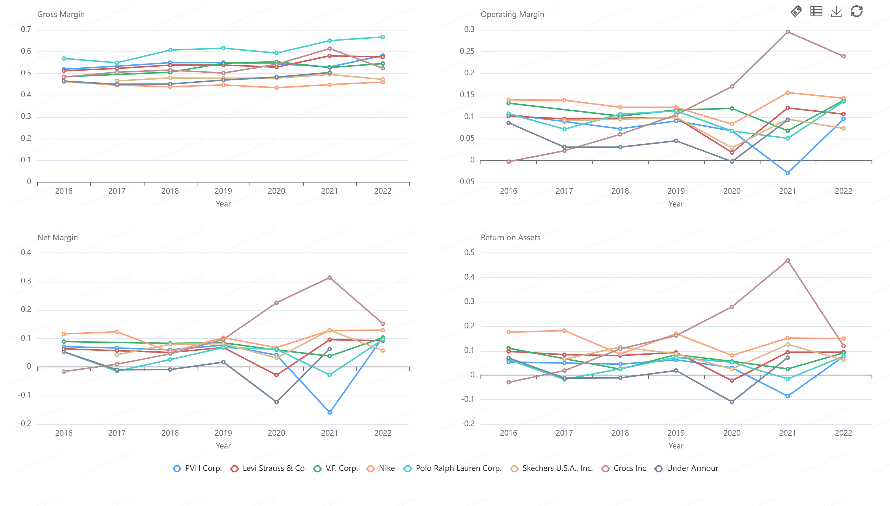In terms of profitability, the company is very stable compared to its competitors. In during the pandemic, Nike only saw a small decline in revenue. What is interesting is Crocs. It came out of the pandemic with growth in net margins, operating margins, and ROA. It was performing much better than all of the other companies. Especially like PVH and Under Armour.