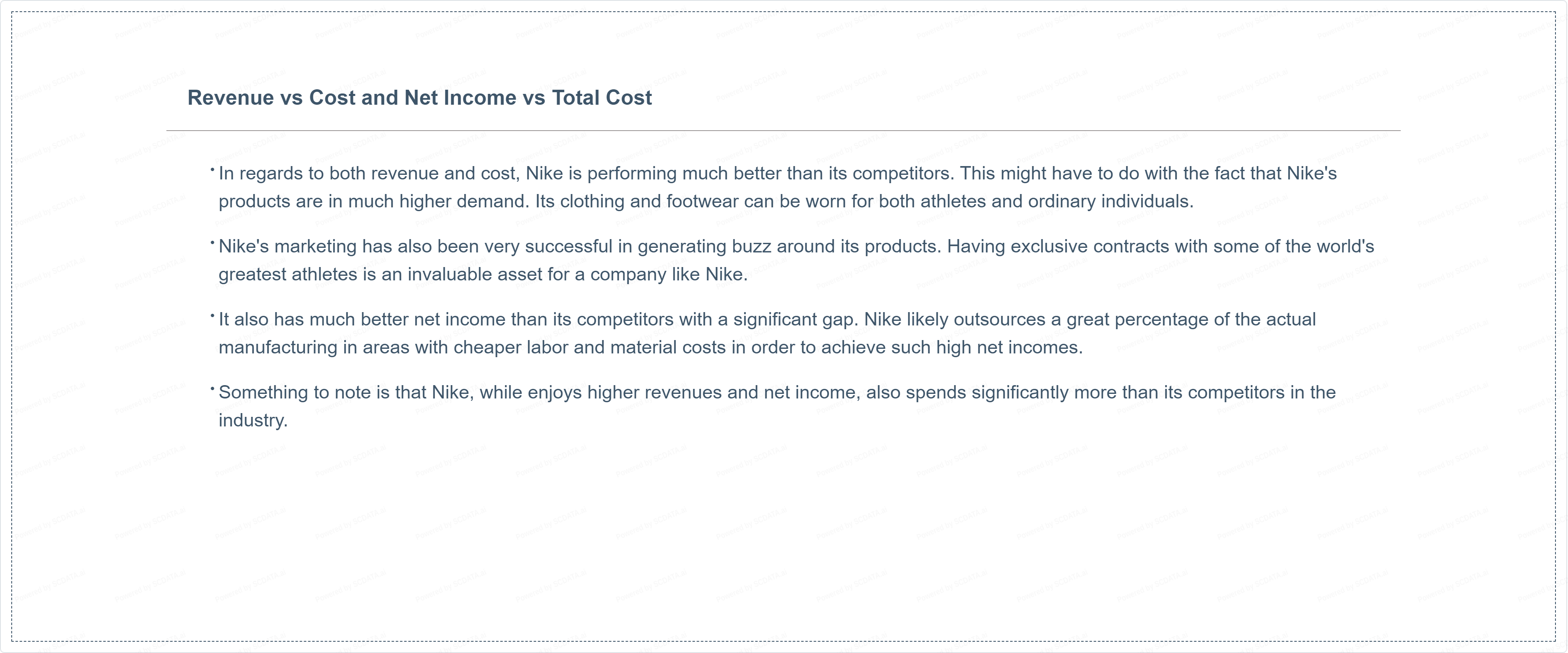 In regards to both revenue and cost, Nike is performing much better than its competitors. This might have to do with the fact that Nike's products are in much higher demand. Its clothing and footwear can be worn for both athletes and ordinary individuals.