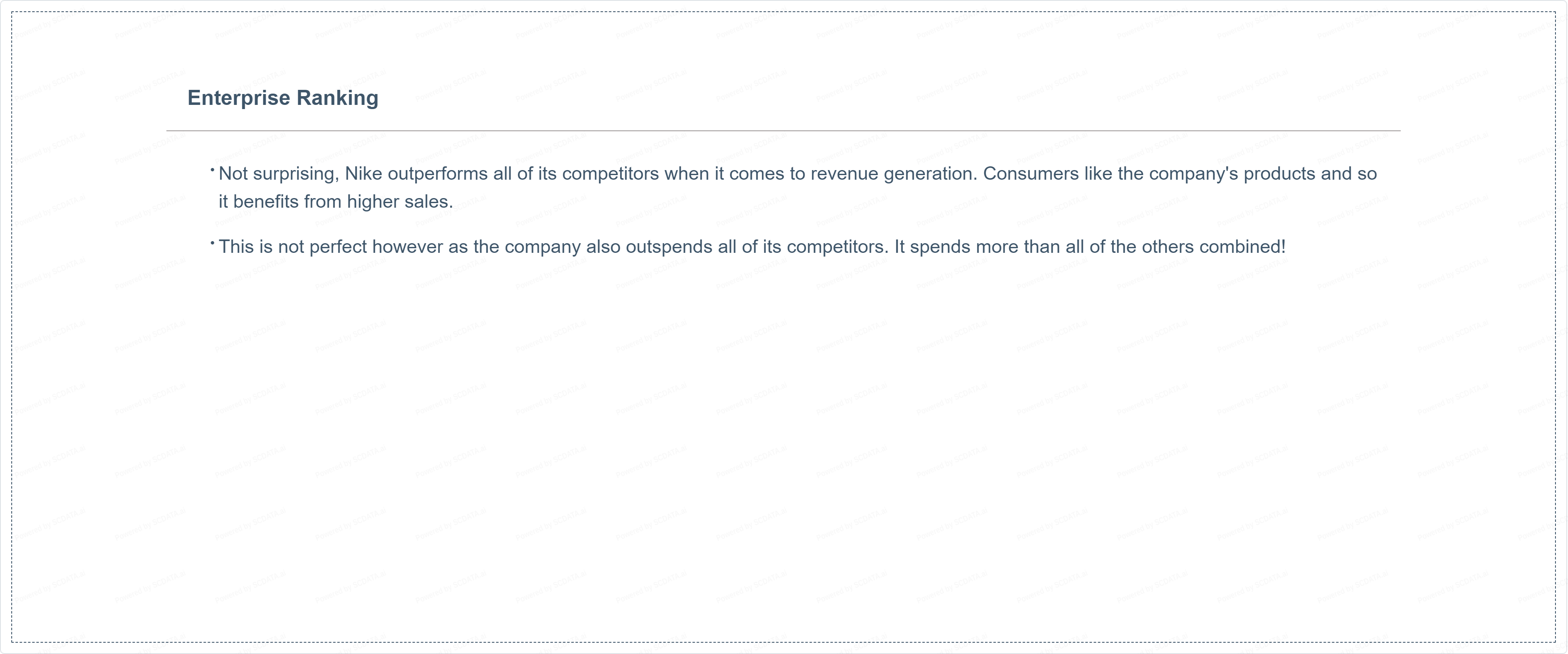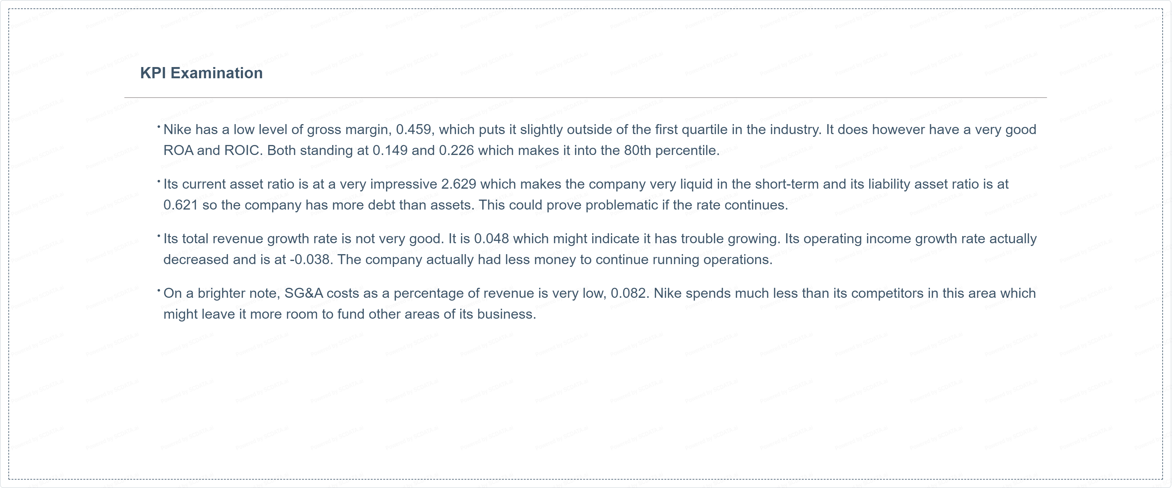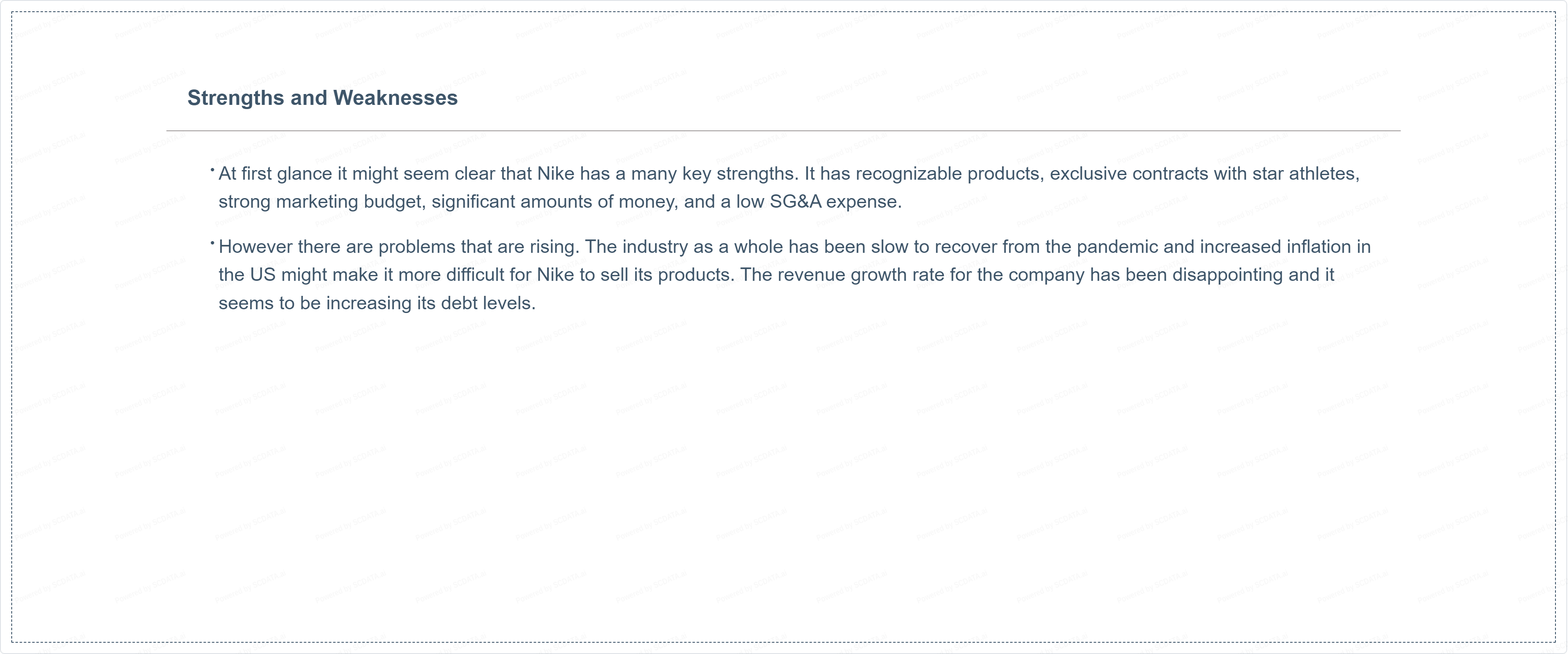 At first glance it might seem clear that Nike has a many key strengths. It has recognizable products, exclusive contracts with star athletes, strong marketing budget, significant amounts of money, and a low SG&A expense.