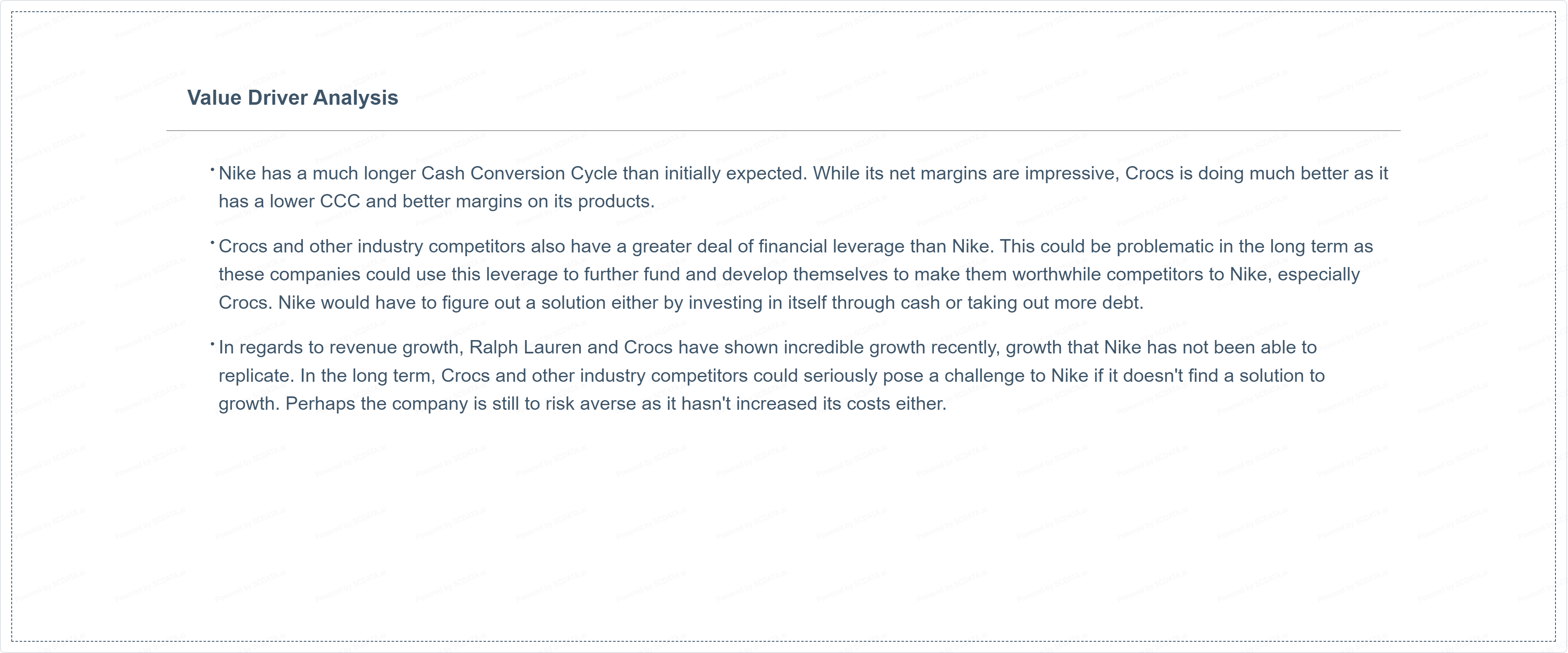 In regards to revenue growth, Ralph Lauren and Crocs have shown incredible growth recently, growth that Nike has not been able to replicate. In the long term, Crocs and other industry competitors could seriously pose a challenge to Nike if it doesn't find a solution to growth. Perhaps the company is still to risk averse as it hasn't increased its costs either.