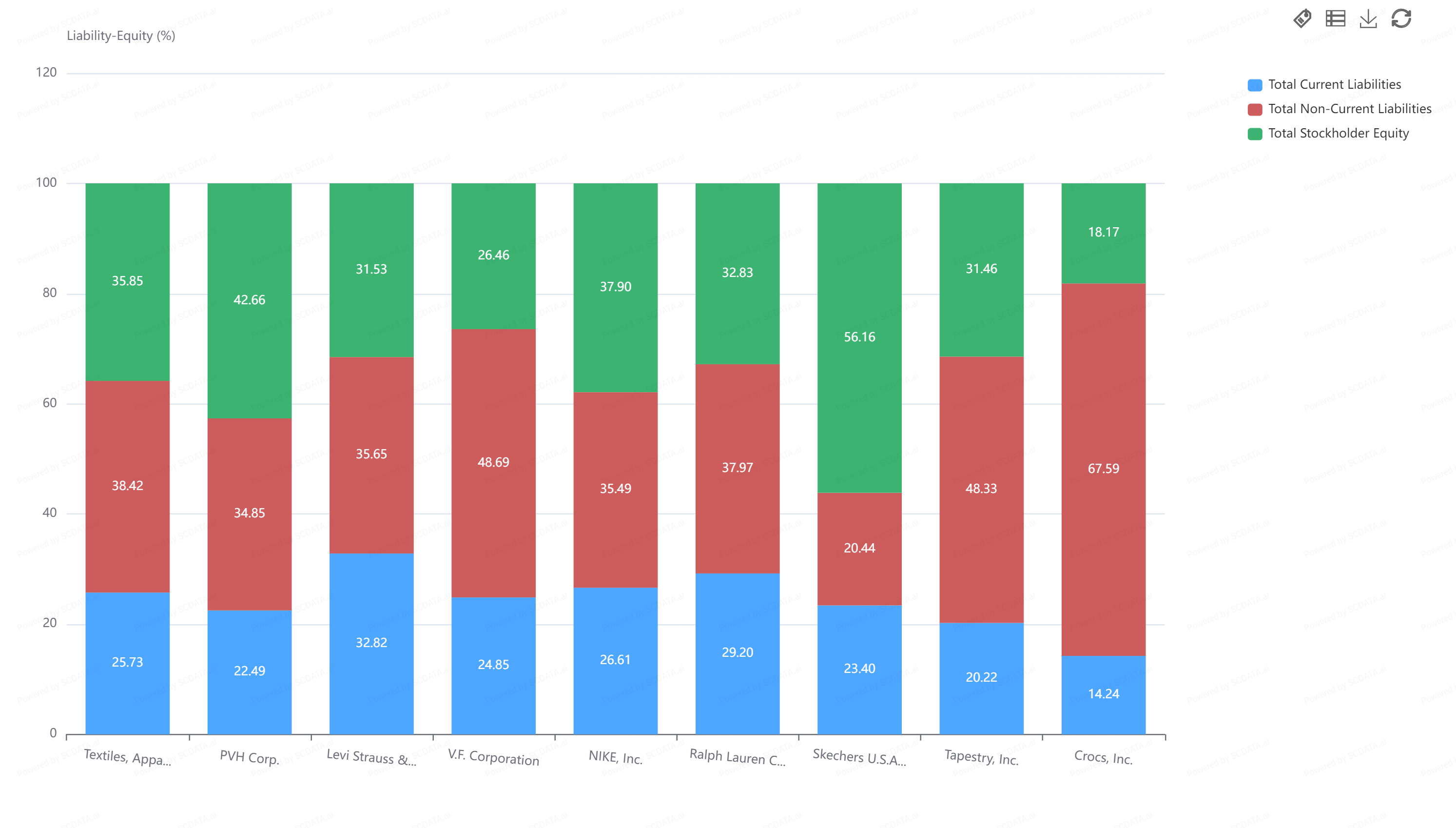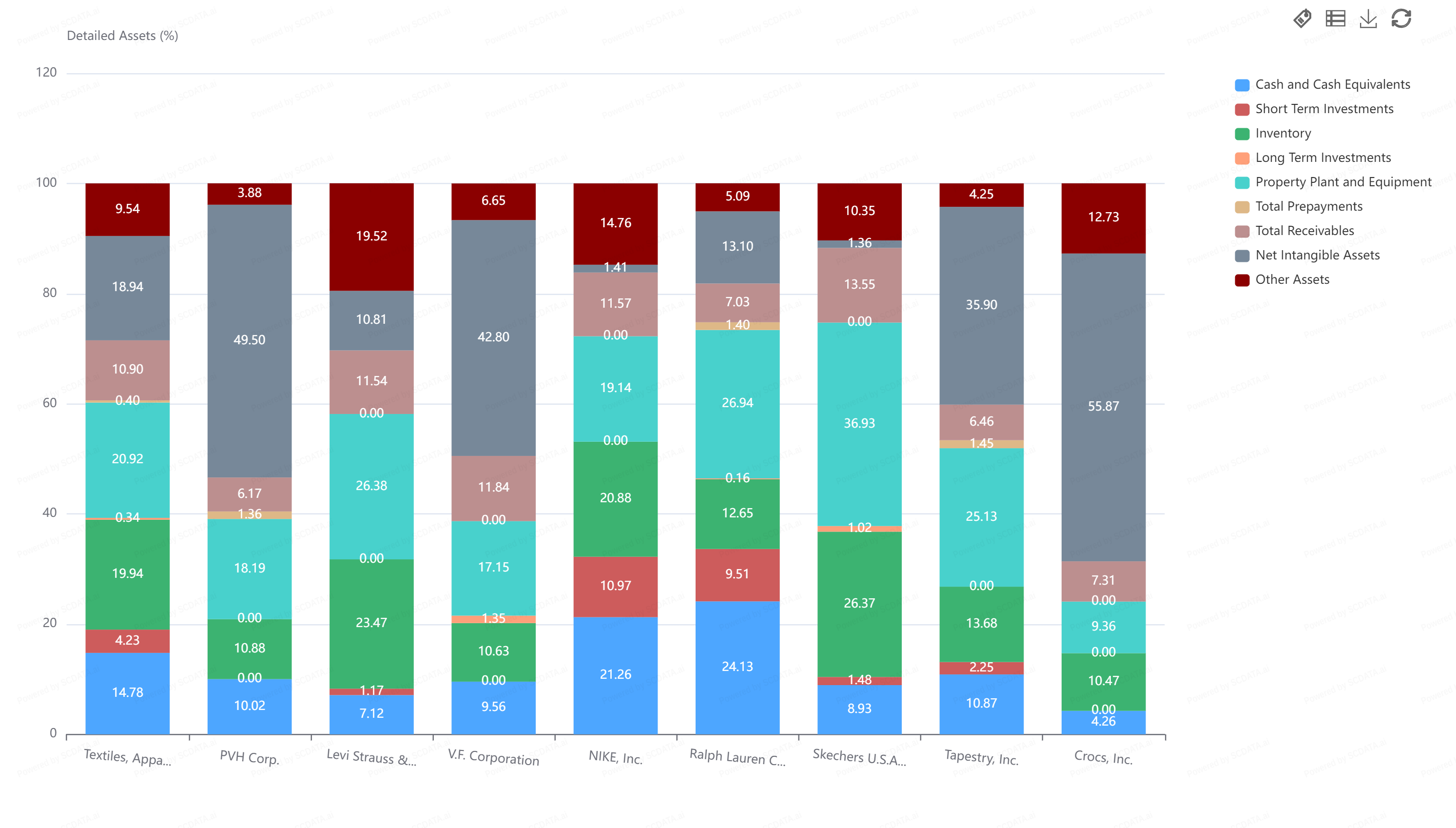 It has more cash and cash equivalents than the industry average and maintains the industry average in both PPE and inventory. These might be areas where it could make improvements. While it is performing better than Ralph Lauren and Sketchers, it has nearly double the inventory, on a percentage basis, than Crocs.