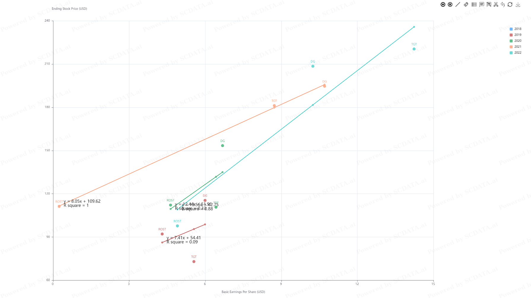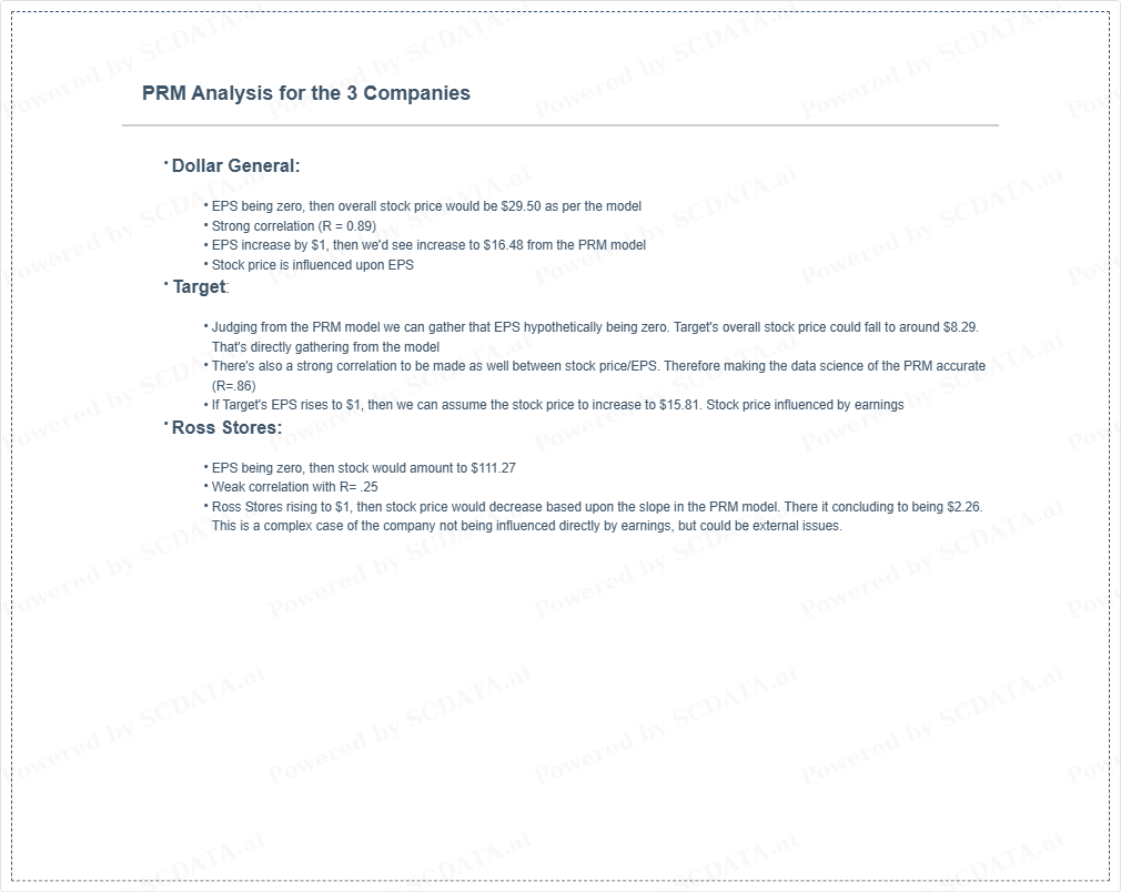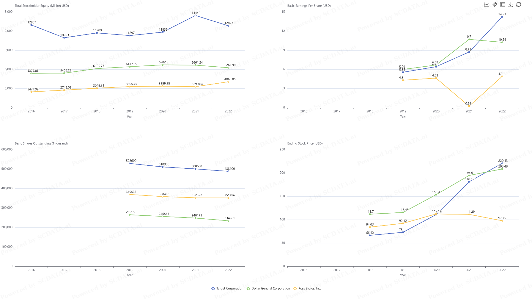 The companies I've selected Target, Dollar General, and Ross Stores. We can the correlations between each company, and there being mixed superiority between each company with mostly Target showing their efficiency. It'll be a great project to analyze each of these companies.