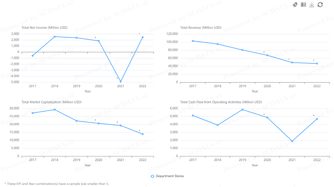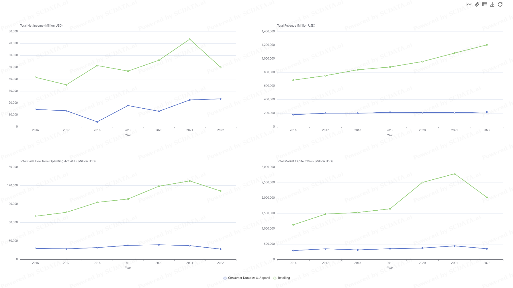 Let’s show the market cap trend for the SP500 companies in retailing and Consumer Durables & Apparel. We can gather that retailing has a clear advantage with every section, but does see slight dips in 2022 for Total Net Income and Total Market Capitalization.