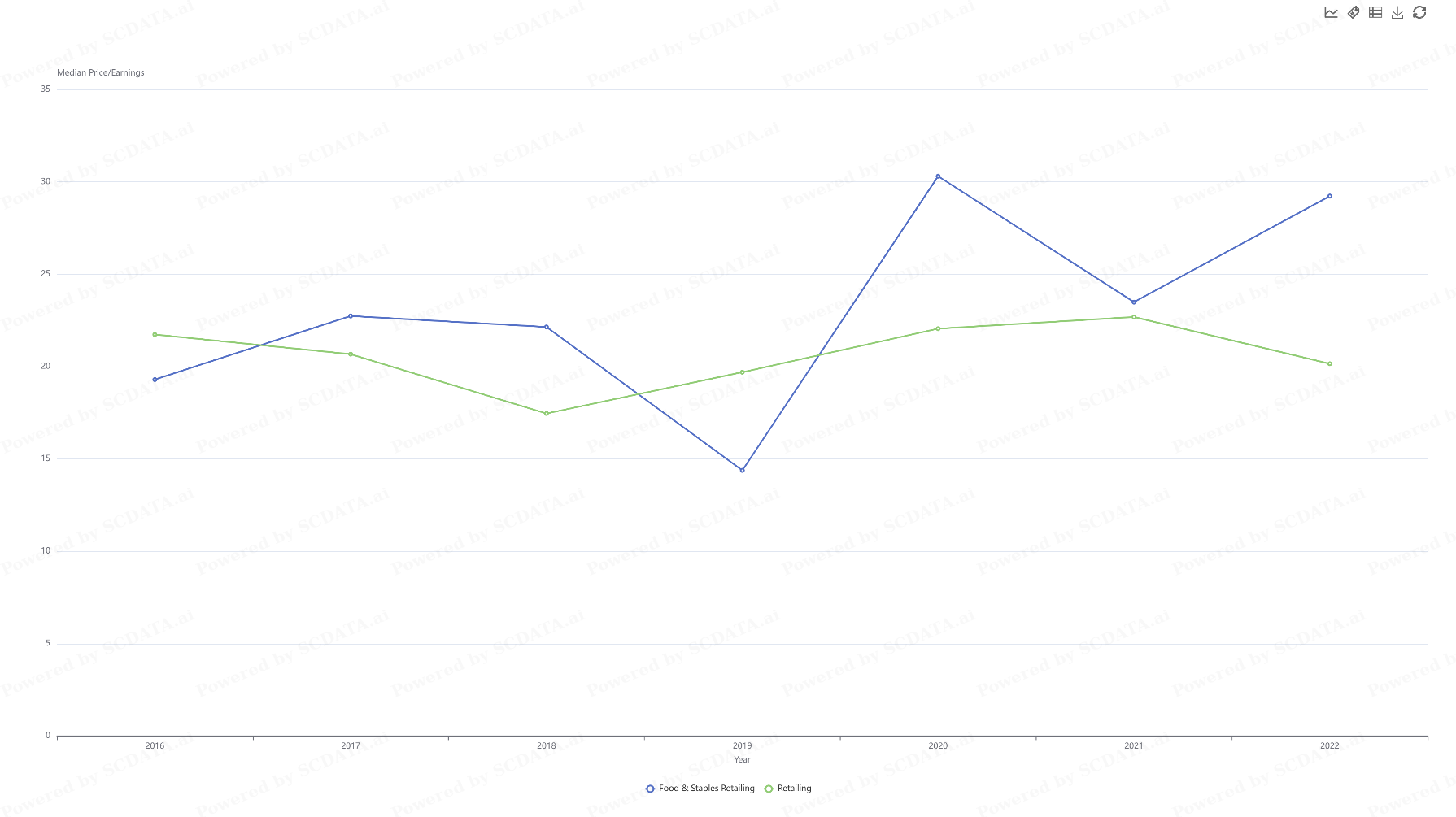 As the professor listed before we can gather from this graph the P/E median being 20 for both retails. With Food & Staples Retailing seeing spikes in 2020 and a slight drop in 2021, but then sees another improvement in 2022.