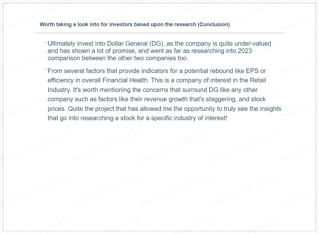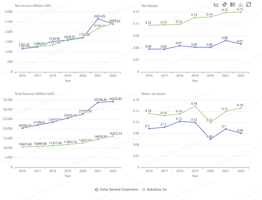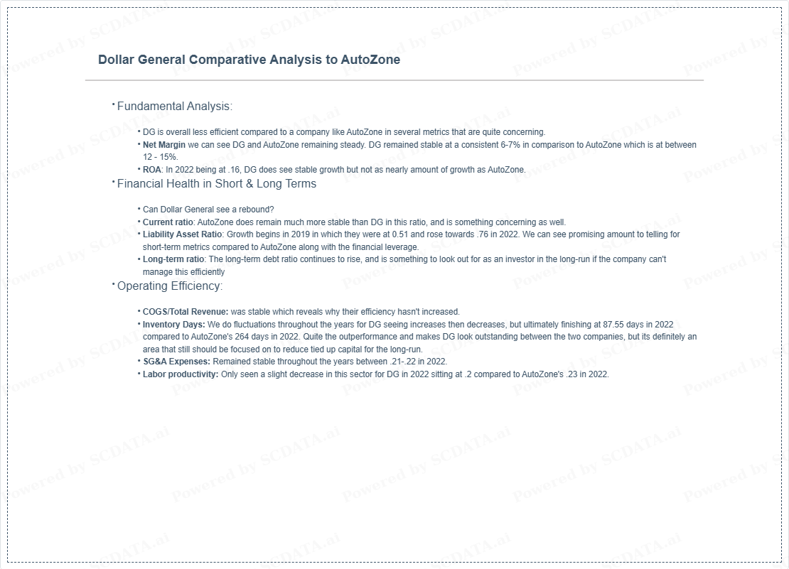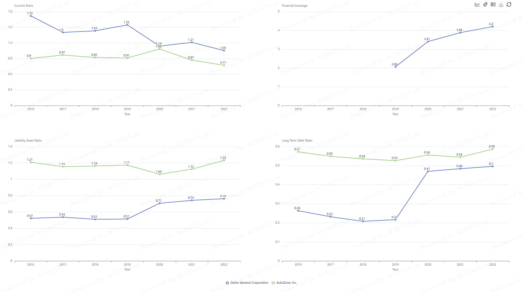 I decided to use AutoZone as a benchmark. As for Dollar General profitability we can see there's stable growth, but there's points that signal DG being less efficient compared to a company such as AutoZone. It's evident since for Net Margin we can see DG and AutoZone remaining steady. Whereas DG floats at a consistent 6-7% in comparison to AutoZone which is at between 12 - 15%. For ROA, this where AutoZone is performing much better than DG. In 2022 being at .16. It's quite telling for DG seeing the immense growth in revenue and net income, but less efficient to what is supposed to a smaller company like AutoZone. Their underperformance is quite concerning to any investor looking to invest with factors such as efficiency falling behind.