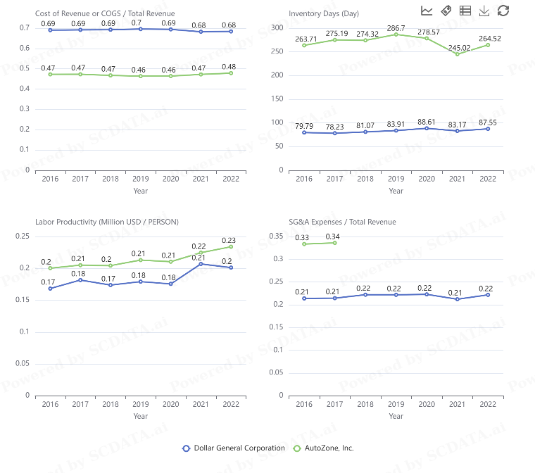 Dollar General's performance for COGS/Total Revenue was stable which reveals why their efficiency hasn't increased. Inventory Days is seeing a slight increase from 83.17 in 2021 to 87.55 in 2022 revealing inefficient supply chain processes for their inventory and capital being tied up. For SG&A Expenses has also remained at a steady 21-22%. Their labor productivity hasn't seen much change, and instead has seen a slight decrease in 2022.