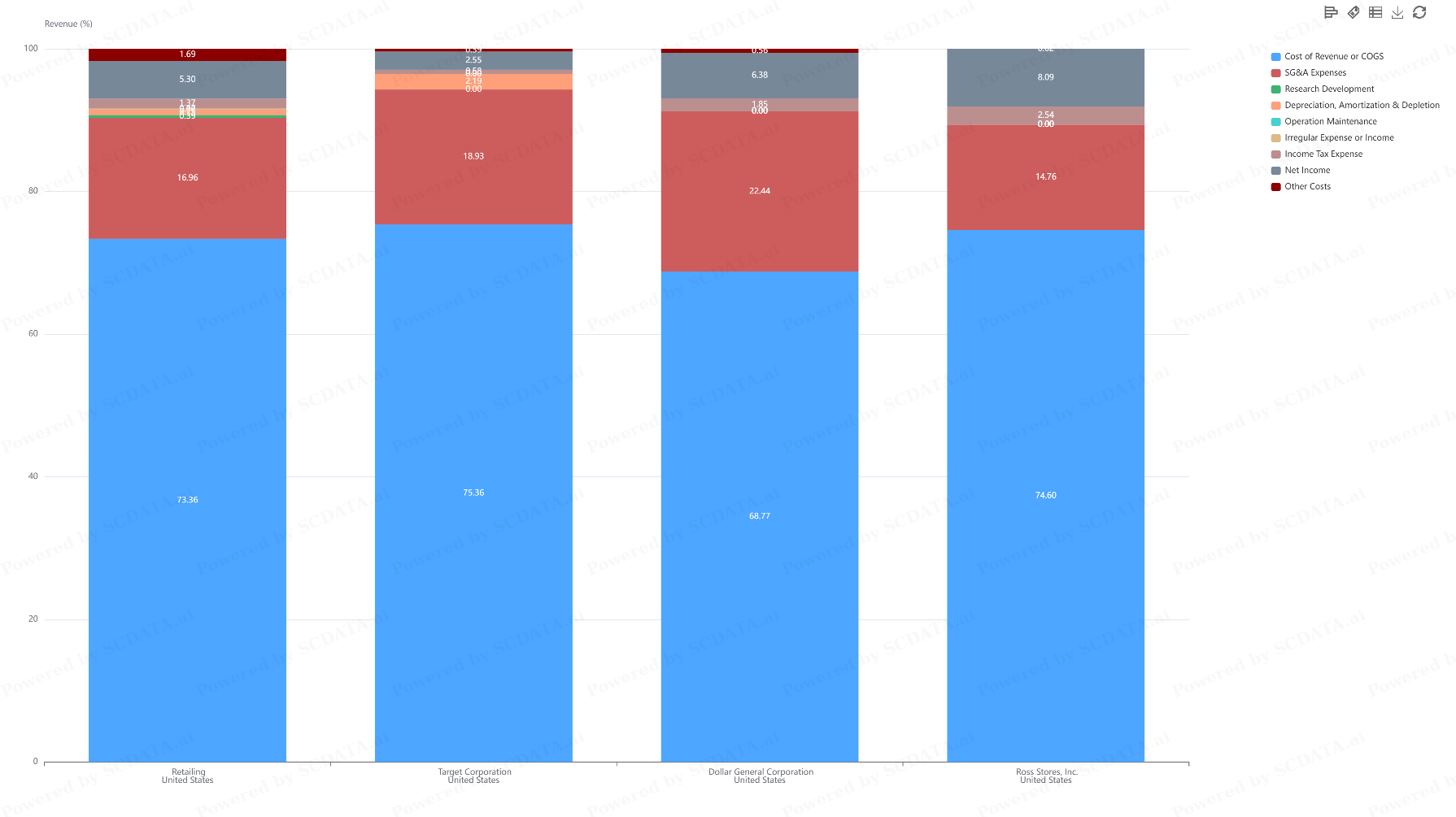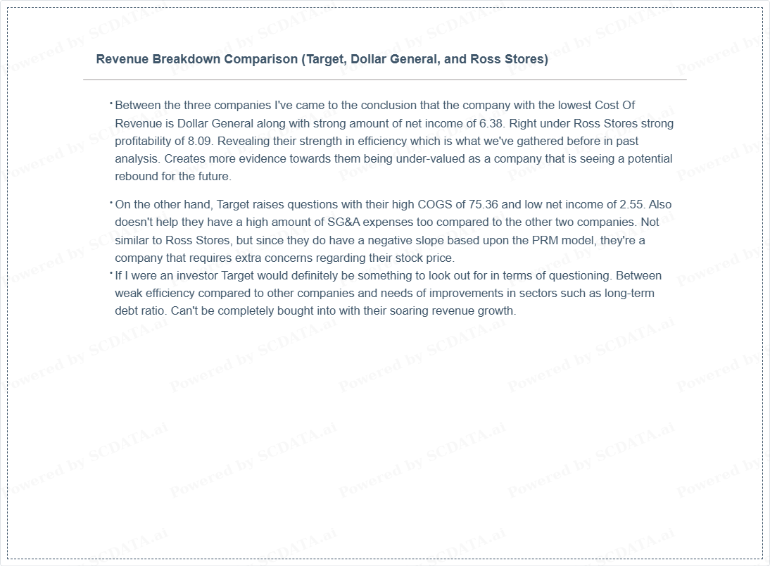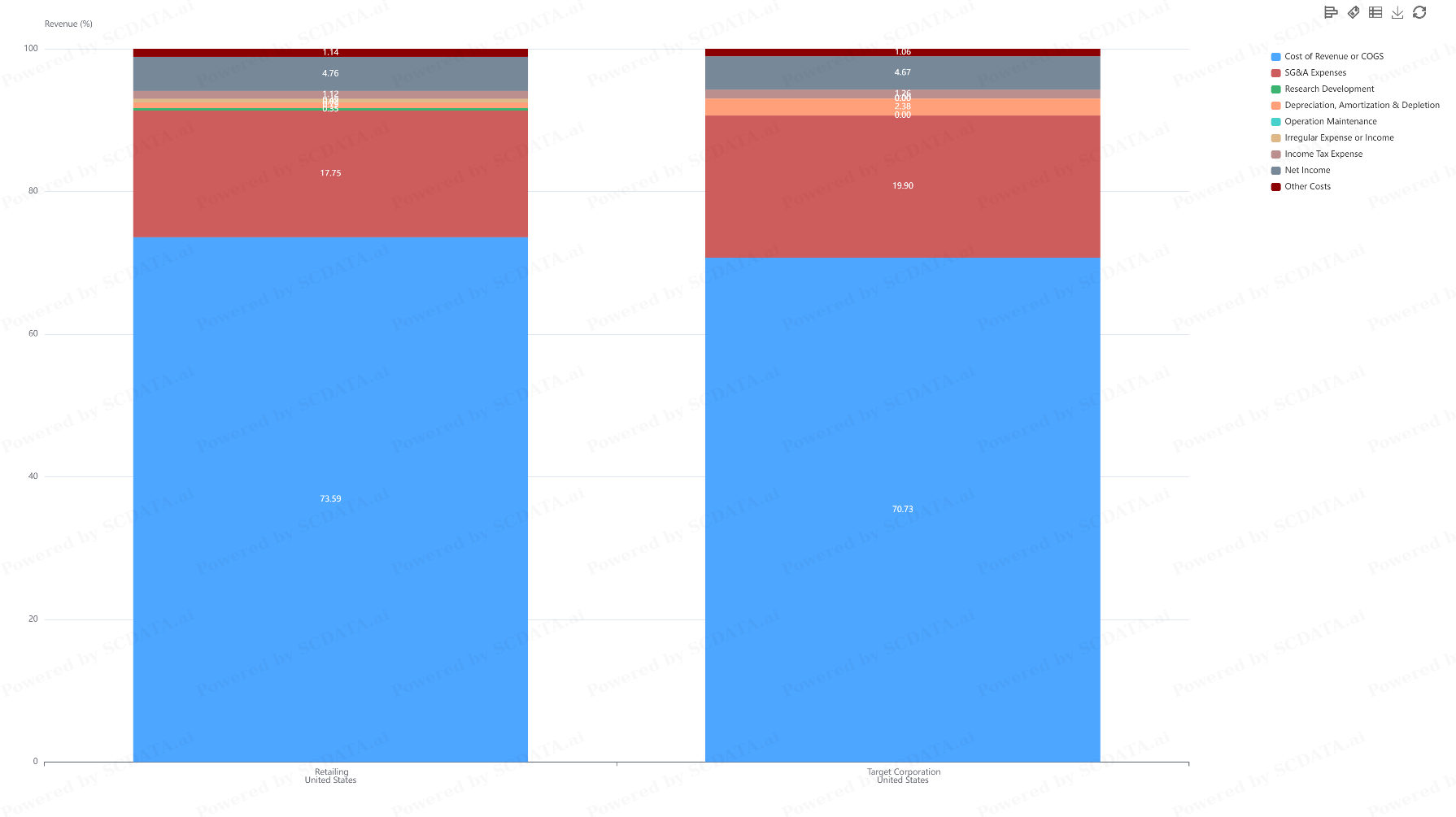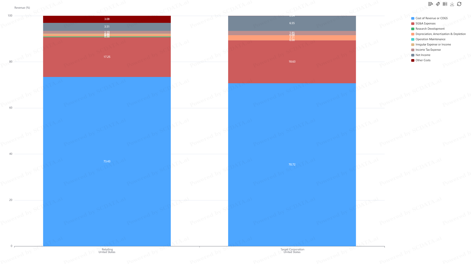 Comparing both revenue breakdowns for 2021 and 2022. We can see that SG&A expenses has slightly decreased in 2022 compared to the initial 19.90%. The COGS has remained steady with it being initially. Other than that nothing to major or straight up distinctions that are outliers even comparing to the industry average in the US. Net Income has rose to about 6.55% in 2022 too, and Other Costs was wiped from Target in 2022 as well.