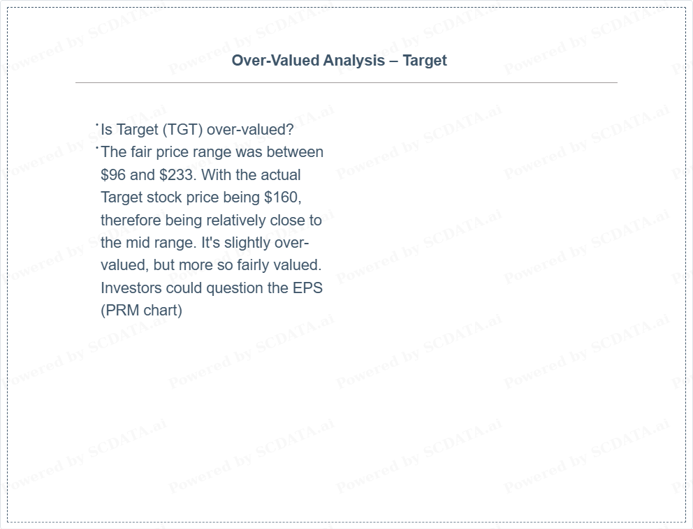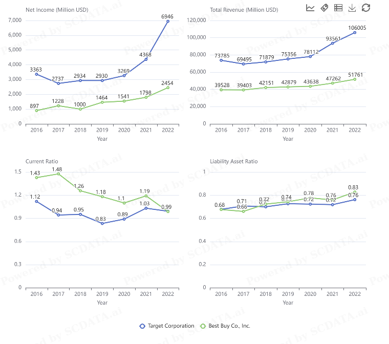 Starting with Net Income, and using Best Buy as a benchmark. We can see Target's impressive growth in net income with the spike in 2022. Current Ratio we can see Target barely hitting above 1.0 assuming that short-term liquidity is solid. Best Buy does have better overall liquidity than Target. Total Revenue shows great recovery from both companies from 2022 and onward. As for Liability Asset Ratio Target does have debt than Best Buy, and in summary we can conclude Best Buy does have more liquidity than Target. As for indications for over-value we can assume from the current ratio in which it barely reaches 1.0 revealing their lack in short-term, and as well as their rising liability asset ratio.