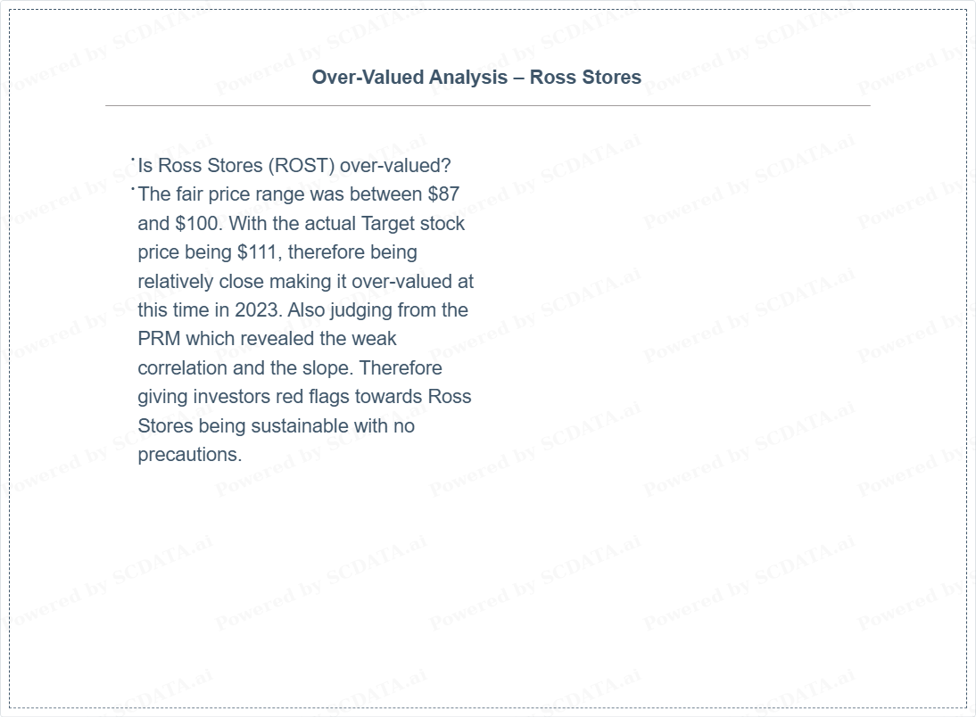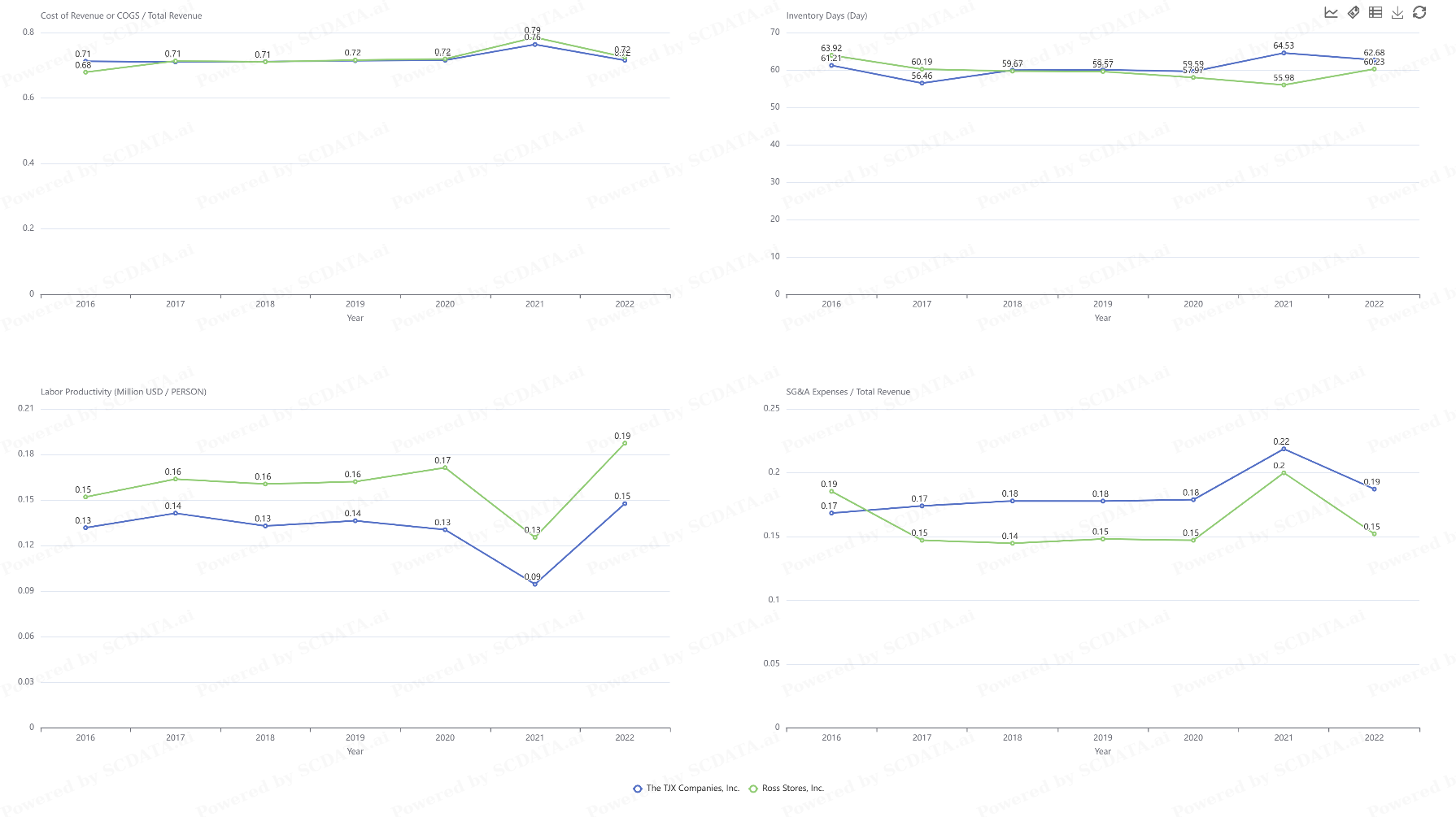 Ross Stores COGS/Total Revenue: They remained stable/constant throughout the years similar to TJX, so there's nothing alarming upon being consistent. Inventory Days: We see an increase compared from 2021 being 55 days to rising to 60 in 2022. Therefore there's a lack of efficient operations when it comes to turning over inventory/tied up capital. Labor Productivity: Ross Stores we can see outperforms TJX in, and reveals several positive indicators such as being efficient when it comes to labor practices. SG&A Expenses/ Total Revenue: They have a stable low SG&A expense, so there's nothing alarming with this either. Inventory Days is something that should be looked into and adds into the over-valuation.