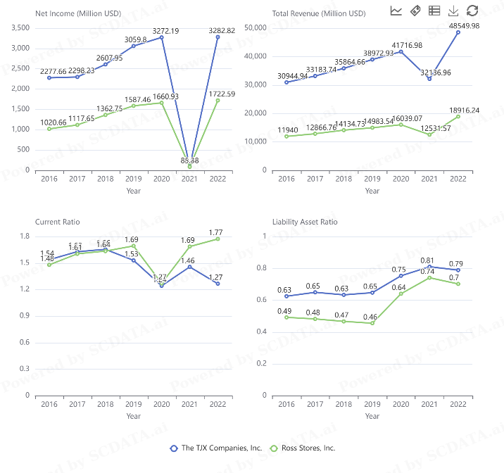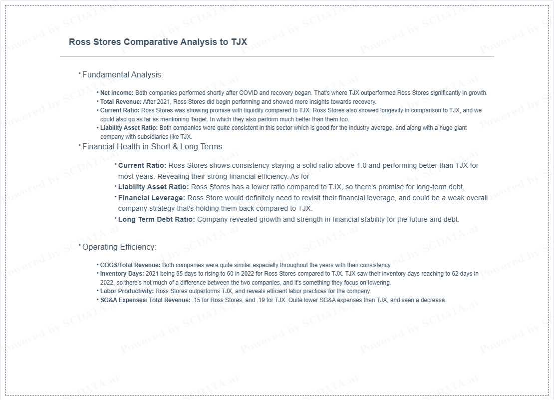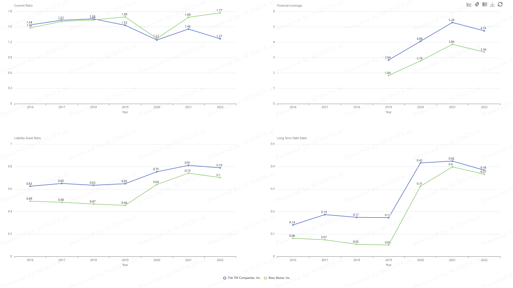 Starting with Current Ratio: Ross Stores shows consistency staying a solid ratio above 1.0 and performing better than TJX for most years. Revealing their strong financial efficiency. As for Liability Asset Ratio, Ross Stores has a lower ratio compared to TJX, so there's promise for long-term debt. Financial Leverage: Ross Stores lacks compared to TJX, so Ross might want to reevaluate some financial plans they had at the time. Long Term Debt Ratio: Ross Stores stayed lower than TJX throughout the years, so it shows they have financial stability and great planning.