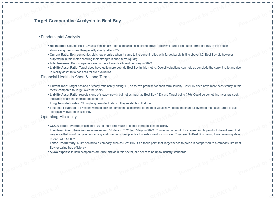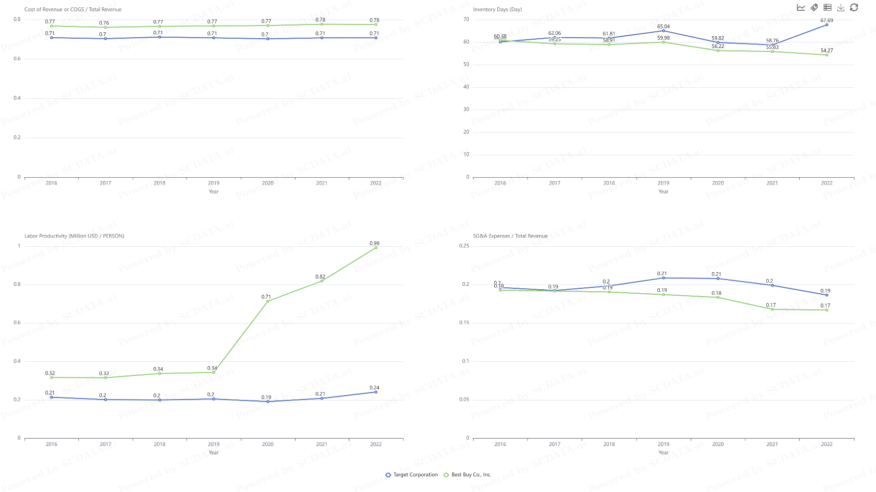 Target's COGS/ Total Revenue is constant .70 so there isn't much to gather there besides efficiency. As for Inventory Days it increased from 58 days in 2021 to 67 days in 2022 so that goes to show their lack of inventory turnover (capital tied up). Labor Productivity reveals their majorly behind to a company such as Best Buy. This is something that Target would want to focus on if they wish to be as efficient as a company like Best Buy. SG&A expenses have remained relatively similar throughout the years with a swing, but not as different as Best Buy. Investors could question efficiency for the long-run especially based on Labor Productivity and the actual price.