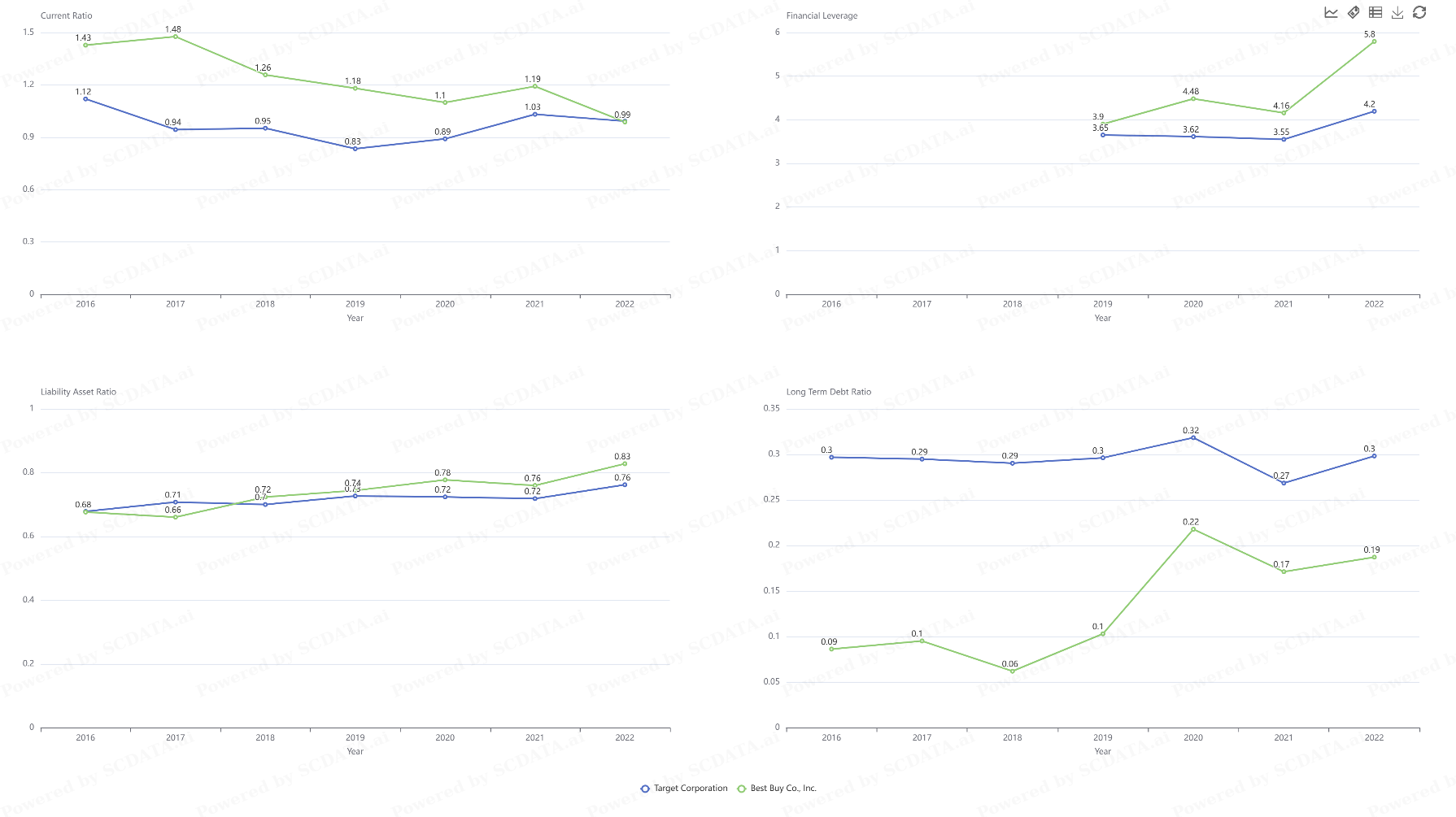 As we can see Target has had a steady ratio barely hitting 1.0, so there's promise for short-term liquidity. Best Buy does have a more promising current ratio though, but nothing too far. Liability Asset Ratio reveals signs of steady growth but not as much as Best Buy (.83) and Target being (.76). Could be something investors seek into when analyzing them for the long-run. They have a strong Long Tern debt ratio, so they're stable in that too. Nothing that shouts out concerns for Target as investors seek to invest, but the only thing to look into would be their Financial Leverage.