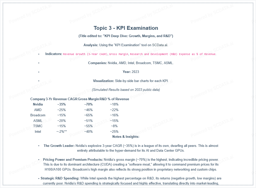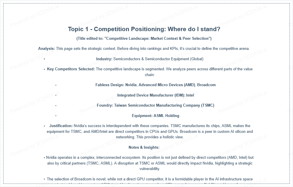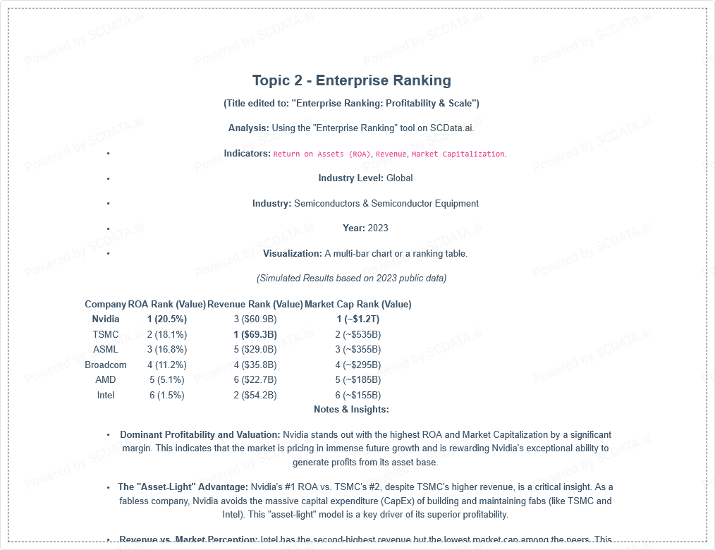 Abstract: This project analyzes the competitive positioning of Nvidia Corporation within the global Semiconductors & Semiconductor Equipment industry, with a focus on the 2023 fiscal year. Utilizing the SCData.ai platform, we employ Enterprise Ranking and KPI Examination to benchmark Nvidia against its key competitors (TSMC, ASML, AMD, Intel, Broadcom). The analysis reveals Nvidia's dominant financial performance and strategic positioning as a "high-growth, high-profitability" leader, largely driven by its AI data center segment. Key insights discuss the sustainability of this position and strategic implications for the broader industry.