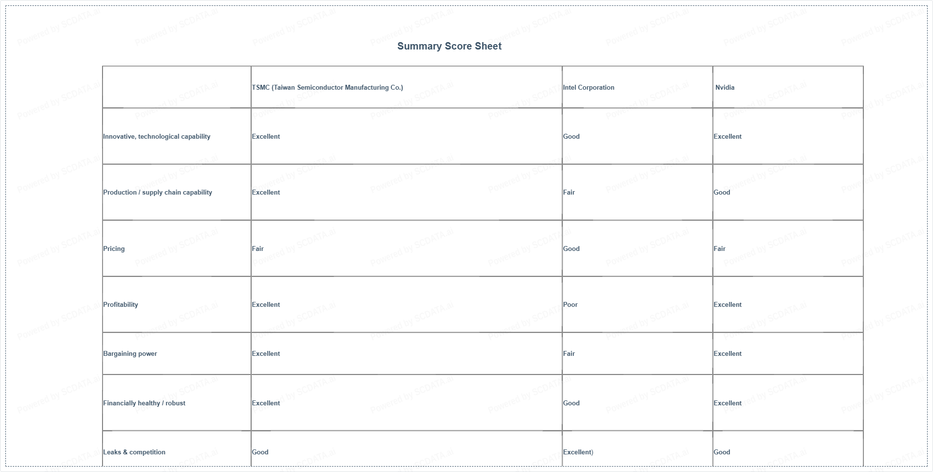 | Production / supply chain capability | Excellent | Fair | Good |
