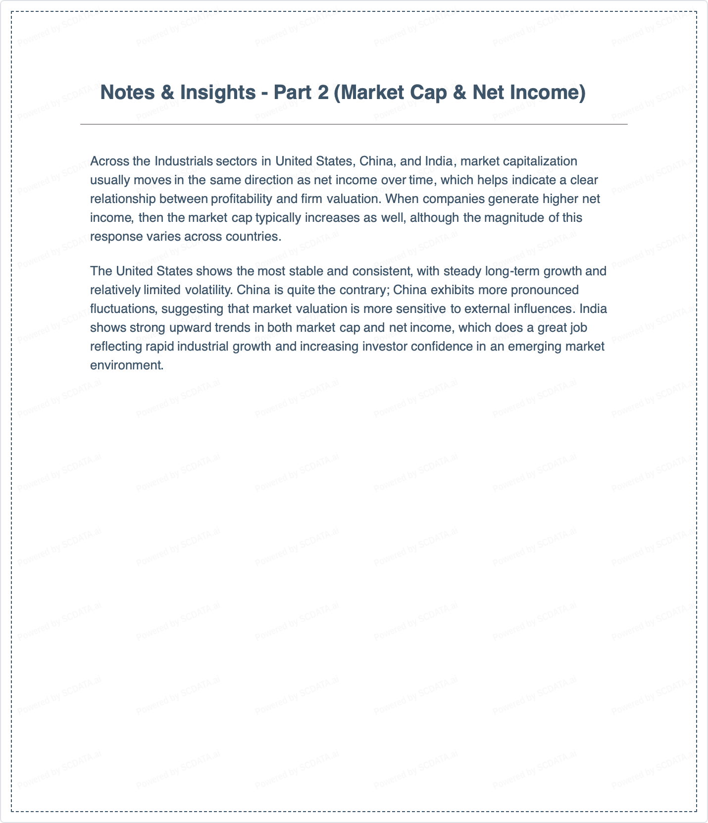The United States shows the most stable and consistent, with steady long-term growth and relatively limited volatility. China is quite the contrary; China exhibits more pronounced fluctuations, suggesting that market valuation is more sensitive to external influences. India shows strong upward trends in both market cap and net income, which does a great job reflecting rapid industrial growth and increasing investor confidence in an emerging market environment.