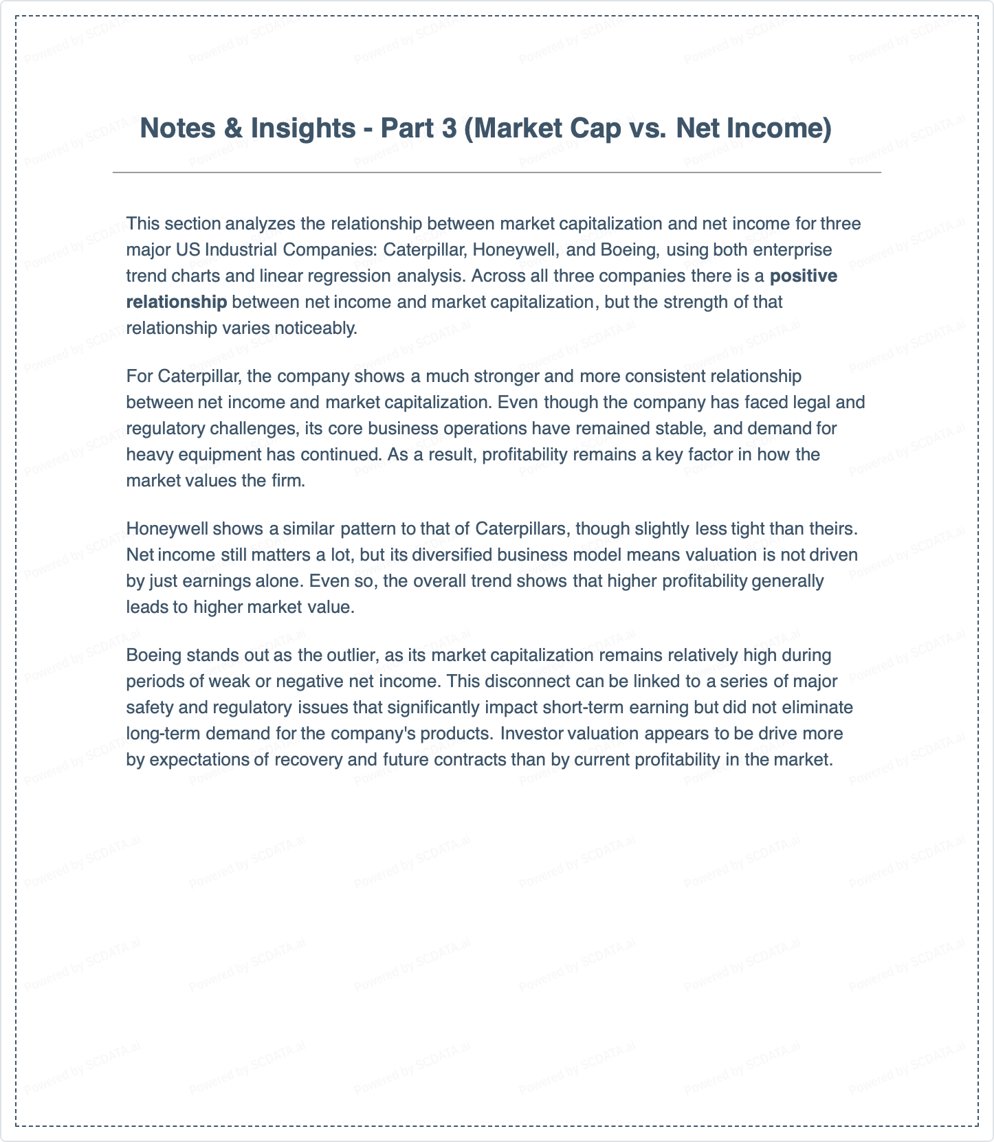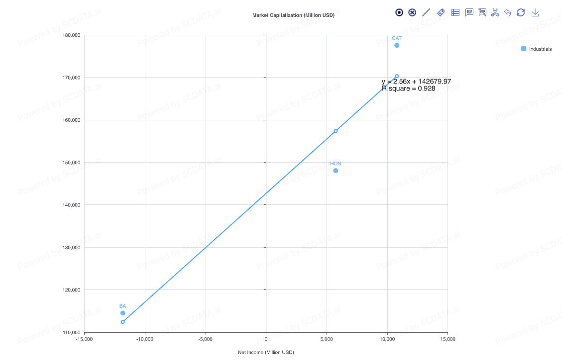 This section analyzes the relationship between market capitalization and net income for three major US Industrial Companies: Caterpillar, Honeywell, and Boeing, using both enterprise trend charts and linear regression analysis. Across all three companies there is a positive relationship between net income and market capitalization, but the strength of that relationship varies noticeably.
