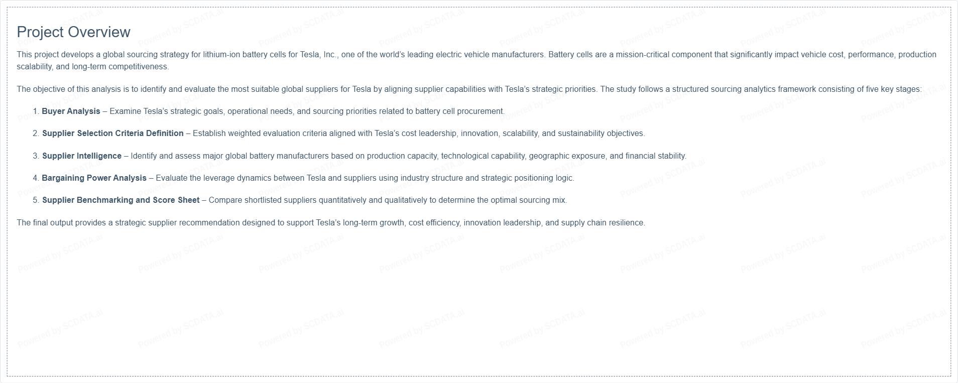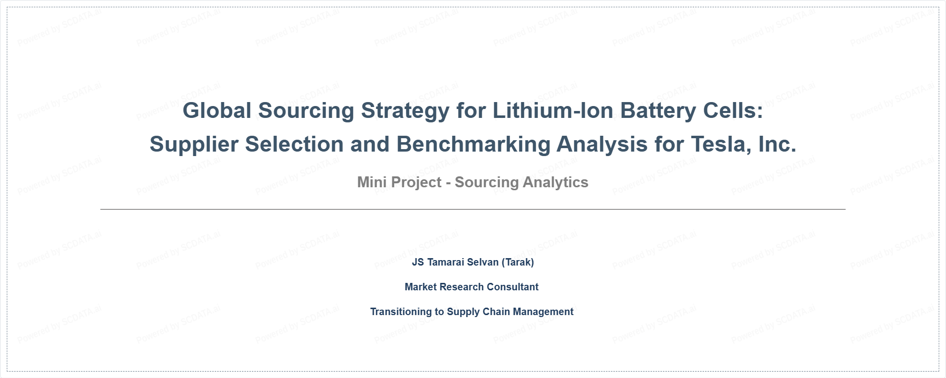 Abstract: This project analyzes the global sourcing strategy for lithium-ion battery cells for Tesla, Inc., a leading electric vehicle manufacturer. Battery cells are a critical component representing a significant share of vehicle cost, performance, and supply chain risk. The analysis evaluates supplier selection criteria aligned with Tesla’s strategic priorities, conducts supplier intelligence on key global manufacturers, assesses bargaining power dynamics between Tesla and suppliers, benchmarks shortlisted suppliers based on financial and operational performance, and develops a summary score sheet. The objective is to identify the most suitable global supplier mix that supports Tesla’s cost leadership, innovation, scalability, and sustainability goals.